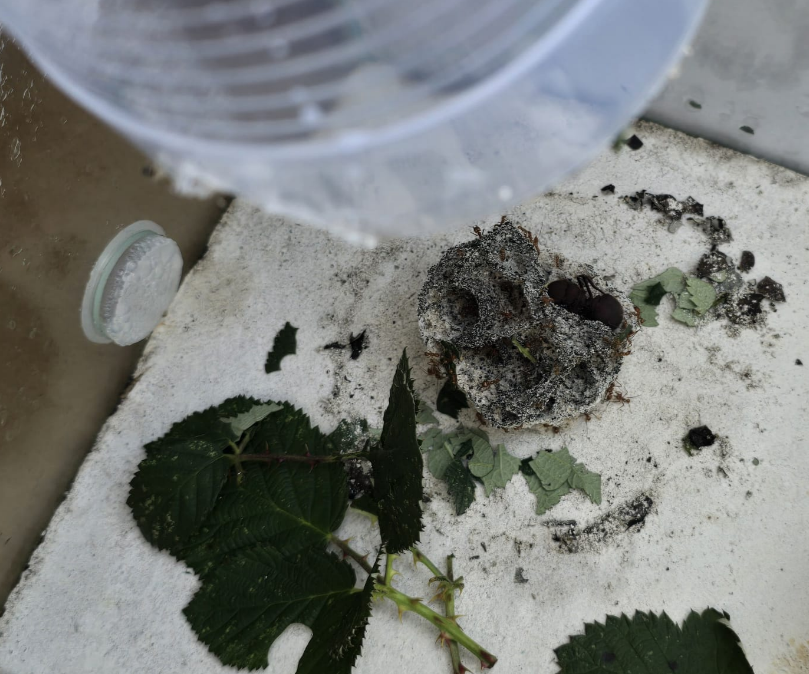 Der PlastikbehĂ€lter ĂŒber dem Pilz hat seitlich zwei Löcher und vorne ein weiteres. Die Ameisen haben die seitlichen Löcher komplett verschlossen und vorne eine Art Tunnel gebaut, etwa 3â4 cm lang, durch den sie zum Pilz gelangen und die BlĂ€tter transportieren.