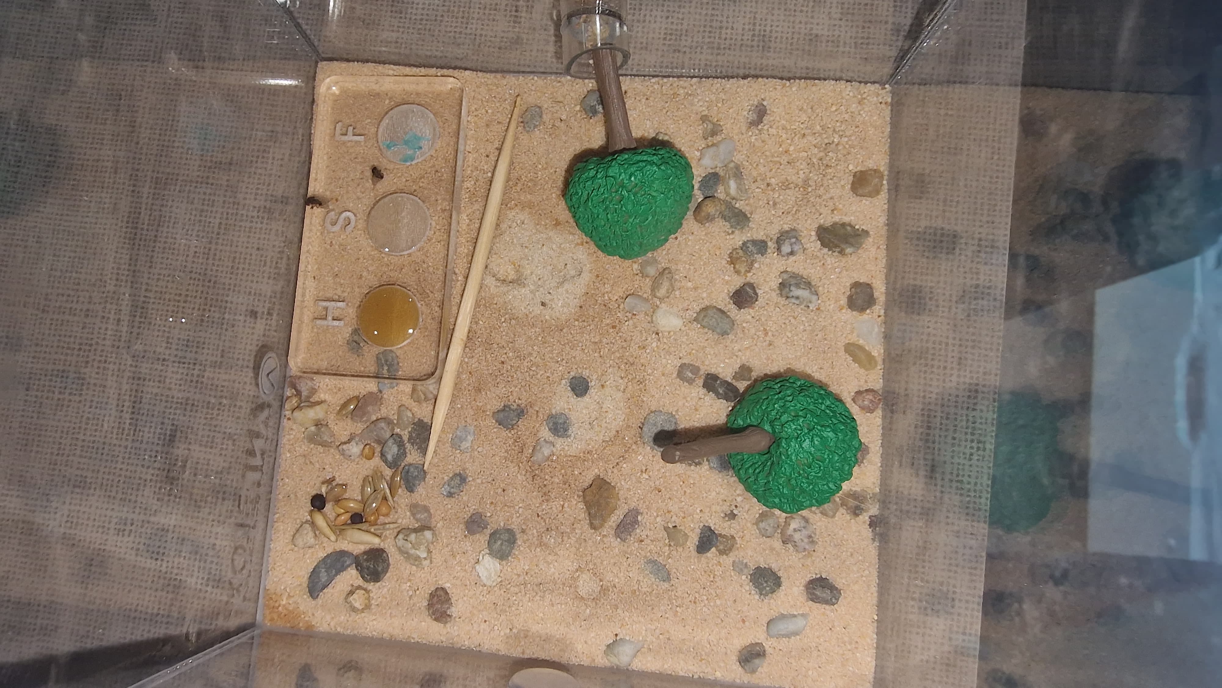 Es waren 3 Ameisen in der Arena und das blieb denn ganzen Tag so unverändert bis es mir komisch vorkam und ich ein Deko teil als eine neue "Brücke" dahin gestellt habe.