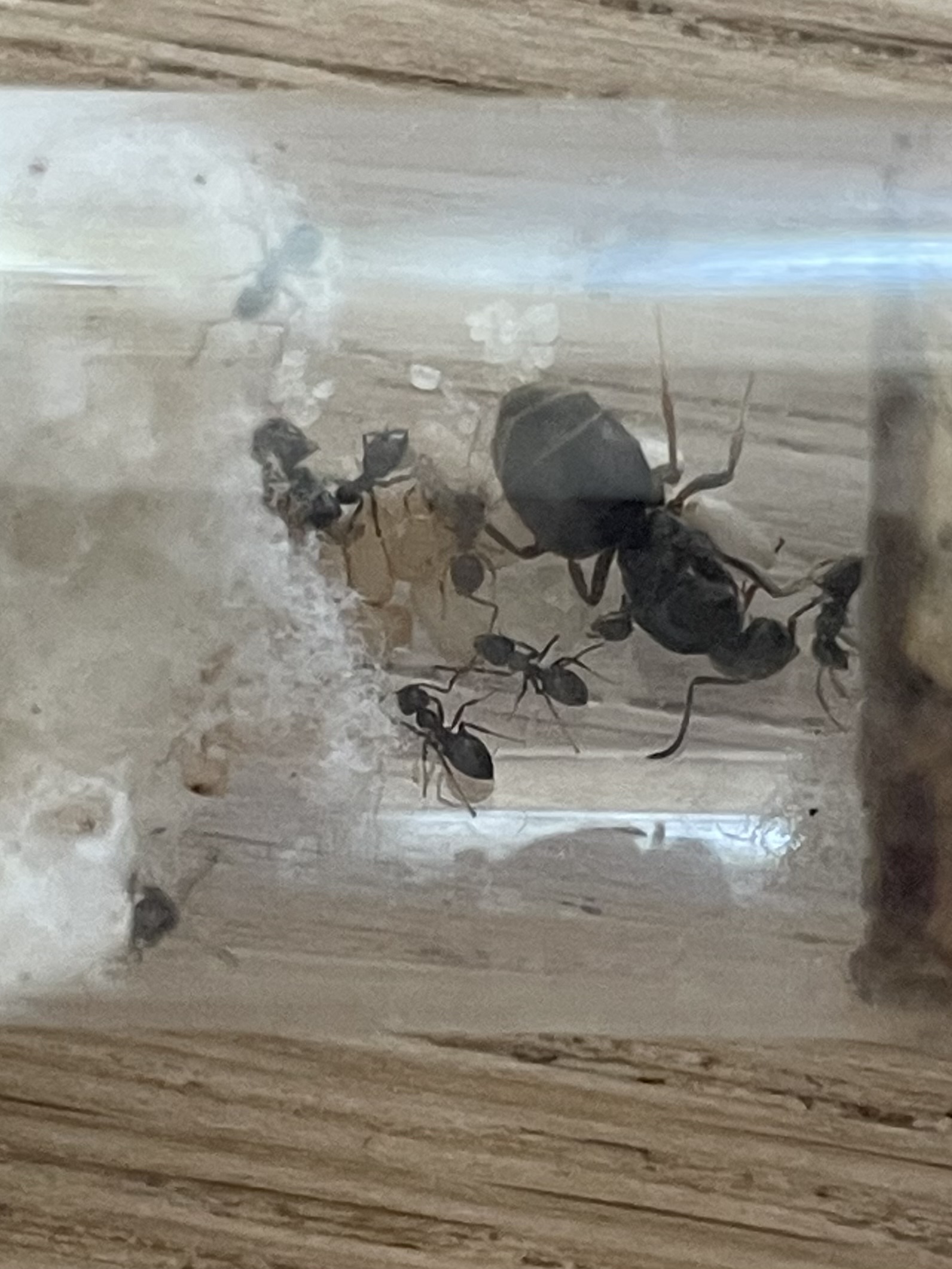 Sie ist nun in einem Reagenzglas mit 5 Arbeiterinnen und sehr viel Brut (Lasius) angeschlossen an eine kleine Arena. Drückt mir die Daumen.