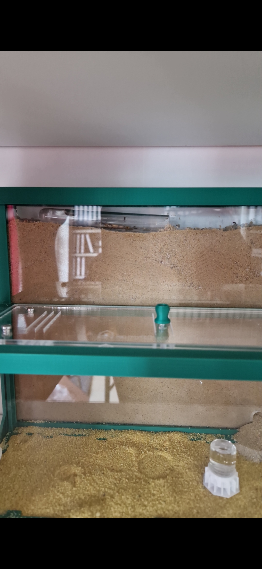 Jedenfalls habe ich heute meine neuen Ameisen in ihr terrarium gesetzt... Leider habe ich diese nicht in den Teil gesetzt indem auch Futter etc gelegt werden kann, und auch eine kleine Ăffnung zum "Nesteingang" Richtung "Nestwand" ist. Sondern habe sie oben auf den Sand in die "Nestwand" gesetzt. (Mit Reagenzglas versteht sich)
