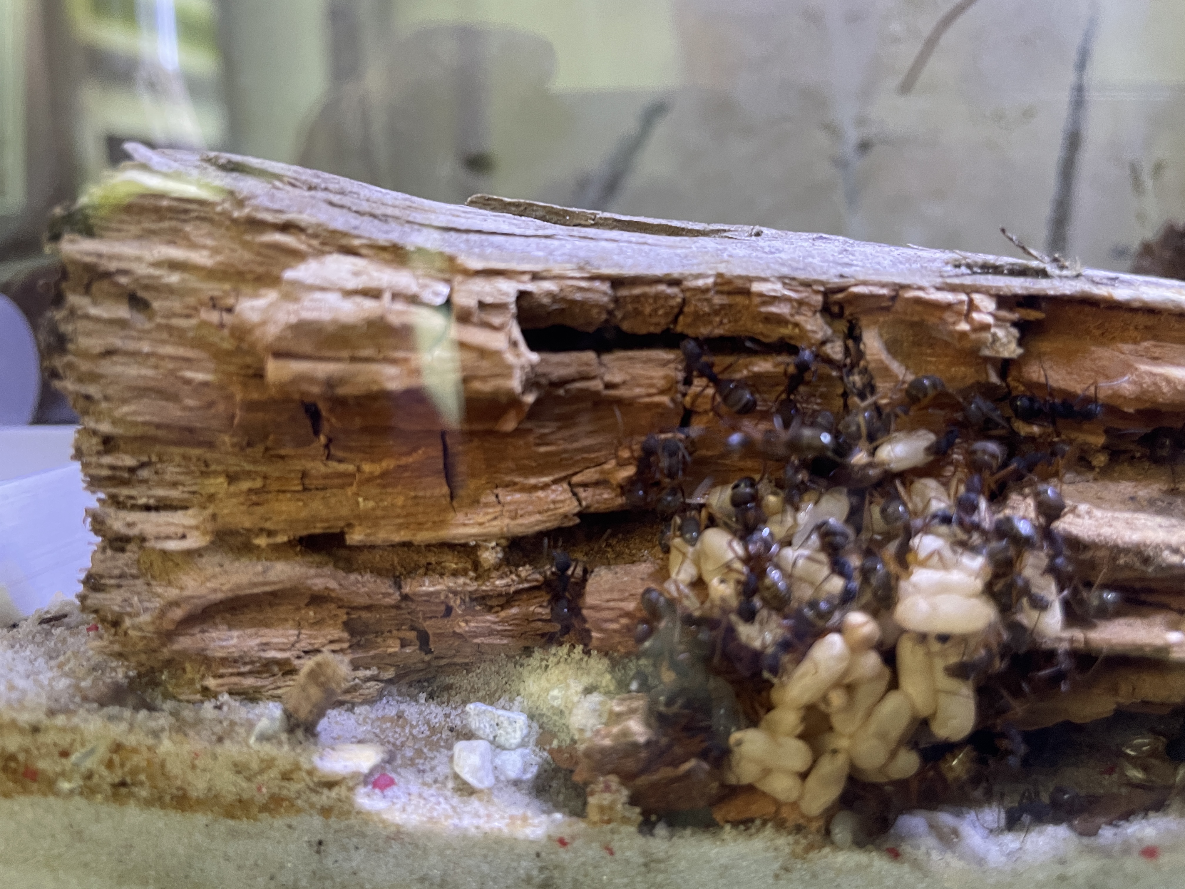 Das ist zwar schön, aber dein Setup bietet den Ameisen kein gutes Nest. Sie sind lediglich in der Not hinter ein Stück Holz gezogen, doch an dieser Stelle wird die Kolonie permanent gestresst sein. Die Kolonie liegt frei für die Außenwelt, und das wollen Ameisen in jedem Fall vermeiden. An dieser Stelle werden sie sich nicht wohl fühlen auf Dauer!