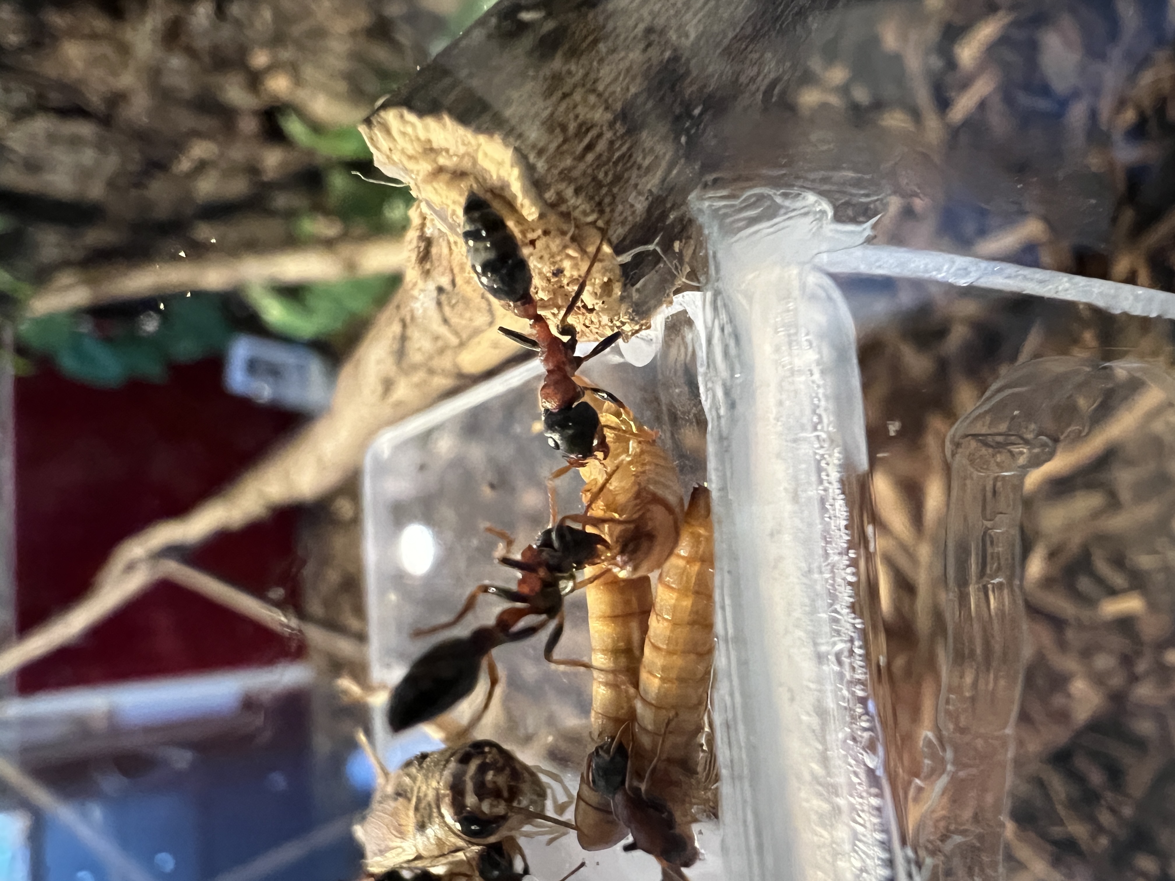 Seit ein paar Wochen ist die AussenaktivitĂ€t markant gestiegen man sieht immer wieder 3- 4 Worker beim erkunden und jagen. Mom. fĂŒttere ich die Damen ca alle 3 Tage mit MehlwĂŒrmern und gefangenen Stubenfliegen ca 6 Futterinsekten die dann meistens innert 2 Tagen zerlegt sind. Da meine Kolonie noch klein ist leben sie in einem modifizierten exo terra mit den massen 30x30x45, das end- Terra wird auch ein modifiziertes exo terra sein, aber deutlich grösser 60x45x90.