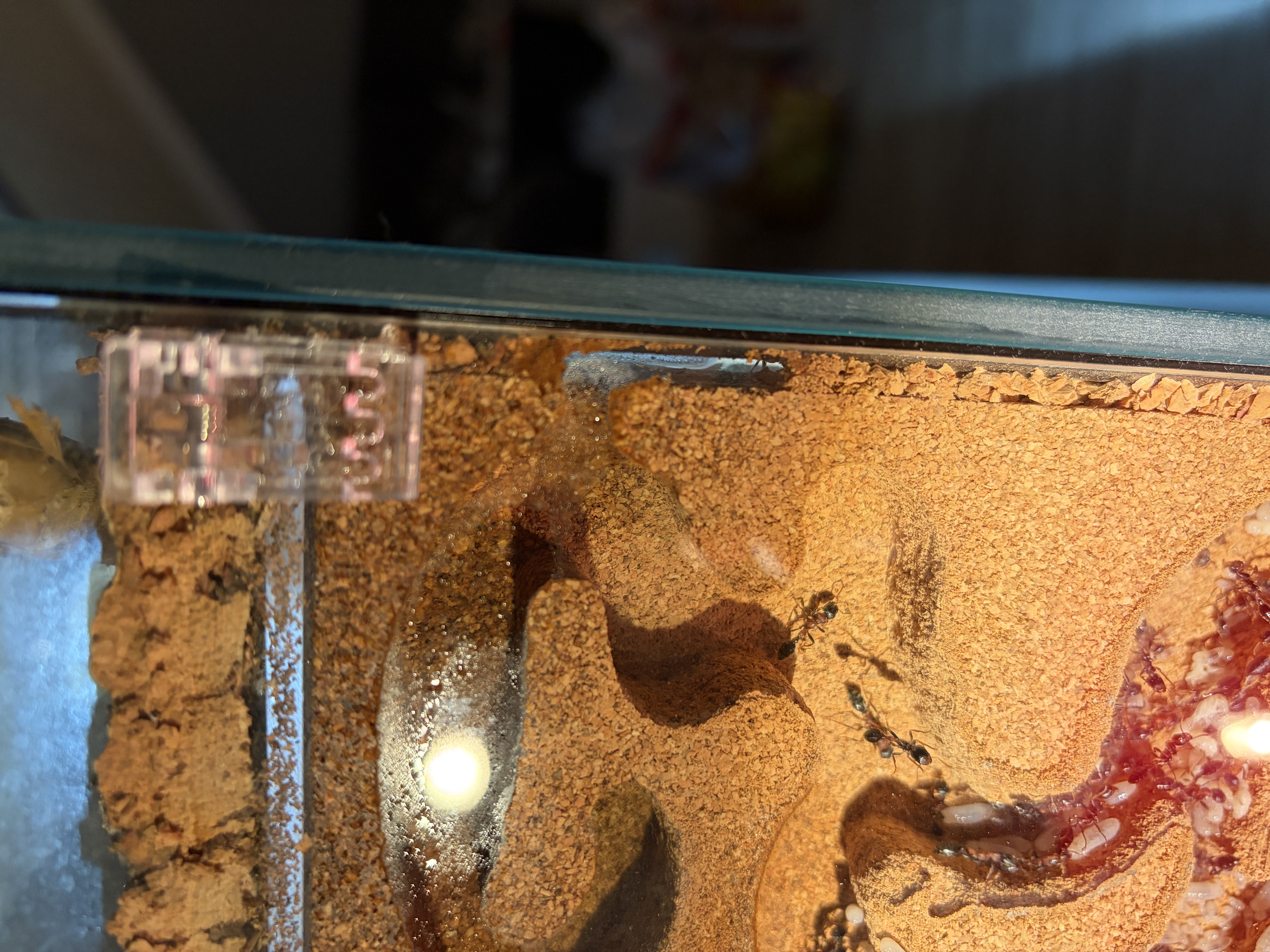 Beim Reinigen ist leider die WĂ€rmelampe kaputt gegangen. Das hat zur Folge, dass die Temperatur um knapp 4 grad gefallen ist. Die Ameisen agieren deutlich trĂ€ger in der Arena. Neue Lampen sind unterwegs. Provisorisch habe ich eine LED reingeschraubt. Eine 35 Watt Lampe wollte ich nicht einsetzten, da dann die Wahrscheinlichkeit wieder steigt, dass sie in der RĂŒckwand graben und umziehen.
