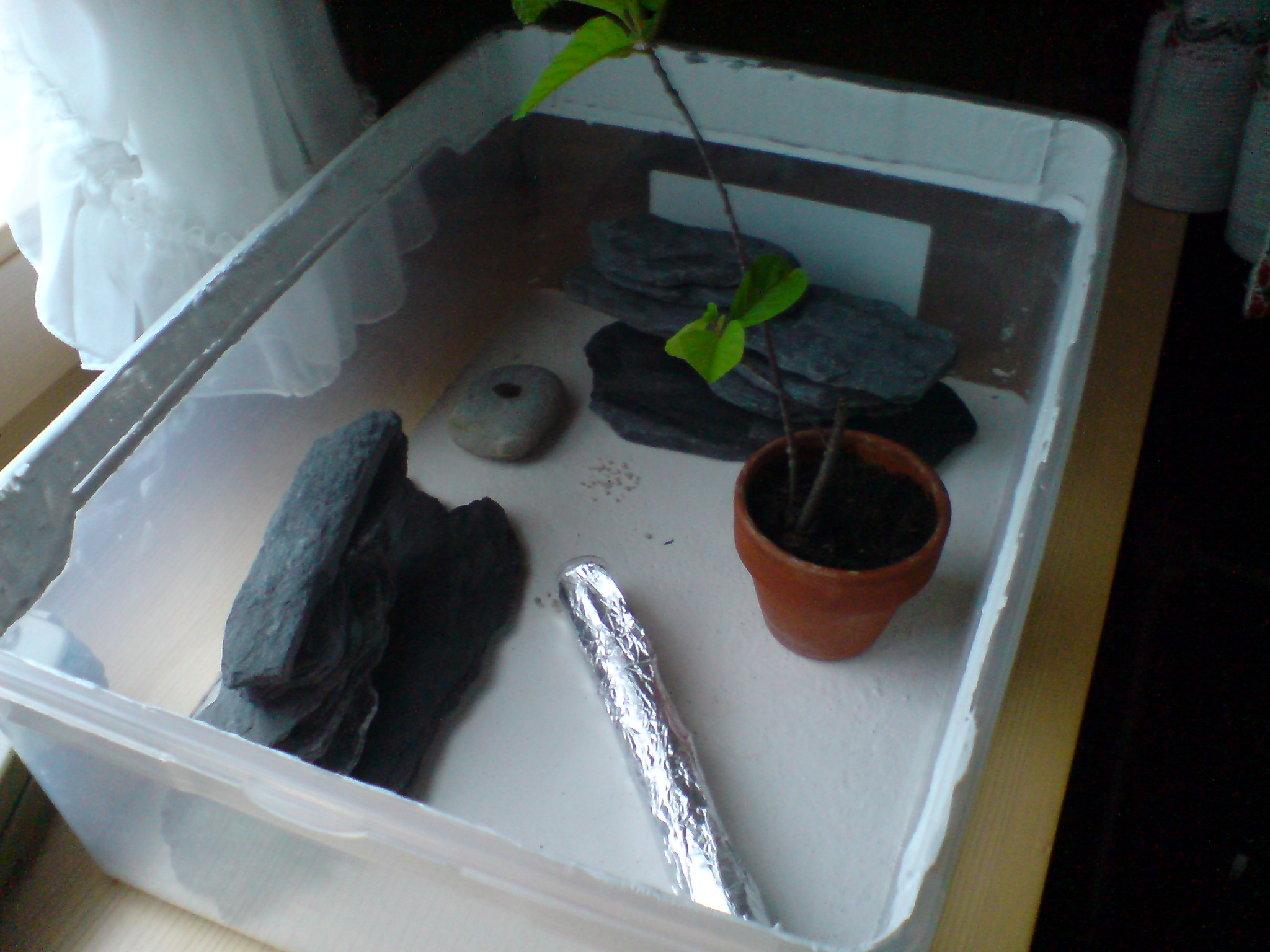 Geheizt wird das Becken mit einer Schreibtischlampe und einem kleinen Leuchtstoffröhrendeckel für ein 60x30cm großes Becken.