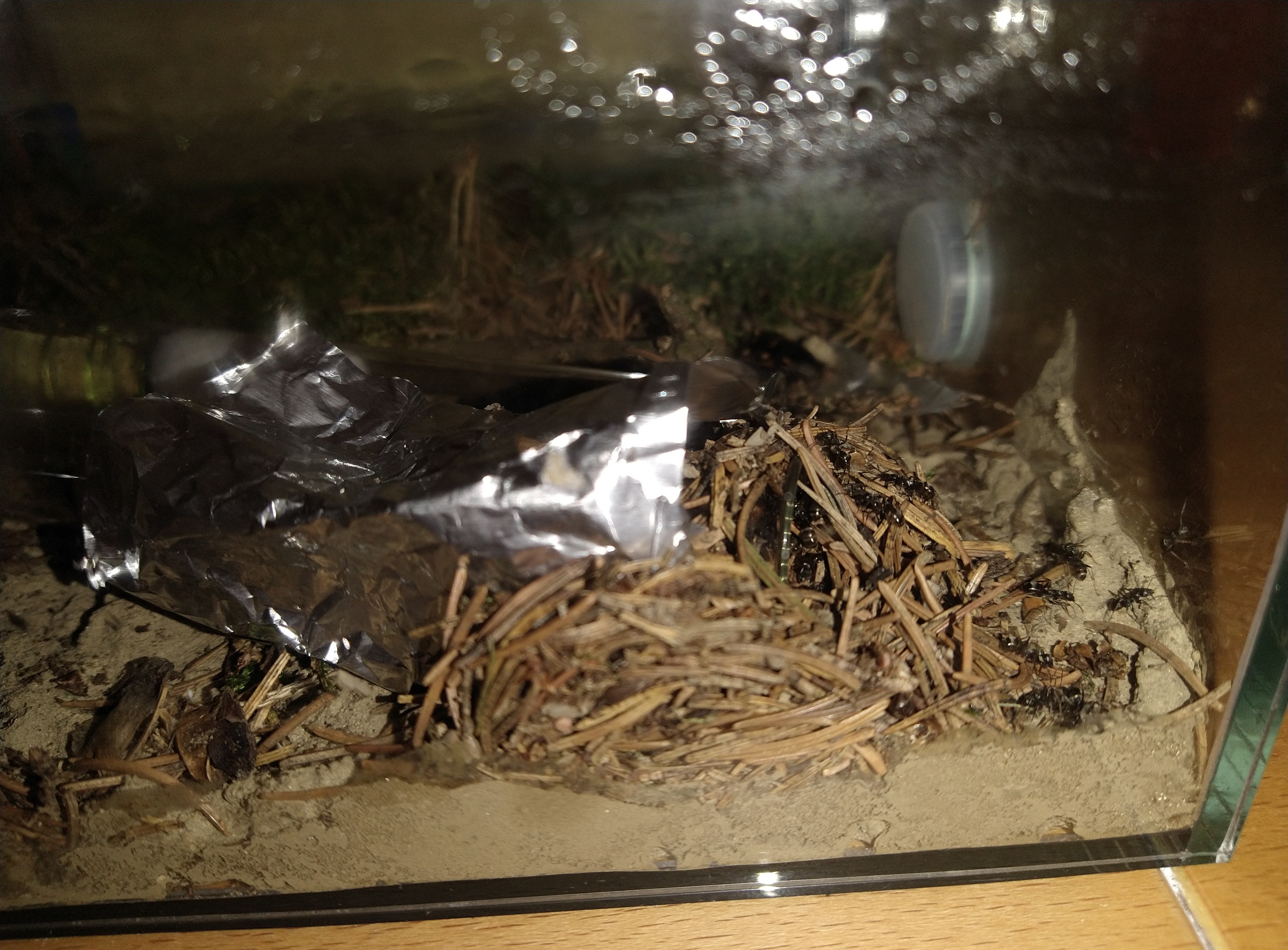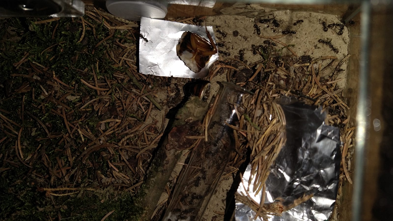 Nachdem ich theoretisch vor gut einer Woche 20 Minuten lang ein Update geschrieben habe, mit allen Hintergrundinfos, dieses dann (warum auch immer) nicht gepostet werden konnte, weil die Seite was dagegen hatte und dann auch noch der ganze Text weg war, ist es mir nun anscheinend wieder möglich, etwas zu schreiben. Im Grunde läuft das alles soweit ganz gut, seit dem letzten Update vor 3 Wochen hat sich nicht viel getan (außer logischerweise 4-5 Fütterungen), einzig die Waldschaben haben sich mit der letzten Fütterung erledigt. Theoretisch habe ich natürlich die Jungtiere zum Verfüttern, allerdings wäre das (einmal ganz pragmatisch gedacht) momentan eine völlig sinnlose Ressourcenverschwendung, weil die alle noch ca. 3-mal so groß werden können wie jetzt. Stattdessen werde (oder habe, je nachdem, wann ihr das lest) ich mir 50 adulte Schokoschaben gekauft. Diese werde ich einfach nur 1-2 Wochen anfüttern, danach alle gesammelt abkochen und einfrieren. Sollte dann hoffentlich langen, bis die Waldschaben adult sind, wenn nicht kann man aber ja die Prozedur noch einmal wiederholen. Die Außenaktivität ist nach wie vor sehr hoch, 30 Arbeiterinnen sind eigentlich immer draußen. Die gestrige Fütterung habe ich leider nicht fotografiert, aber zumindest kann ich euch die Bilder der vorletzen Fütterung (10 Tage her) zeigen.