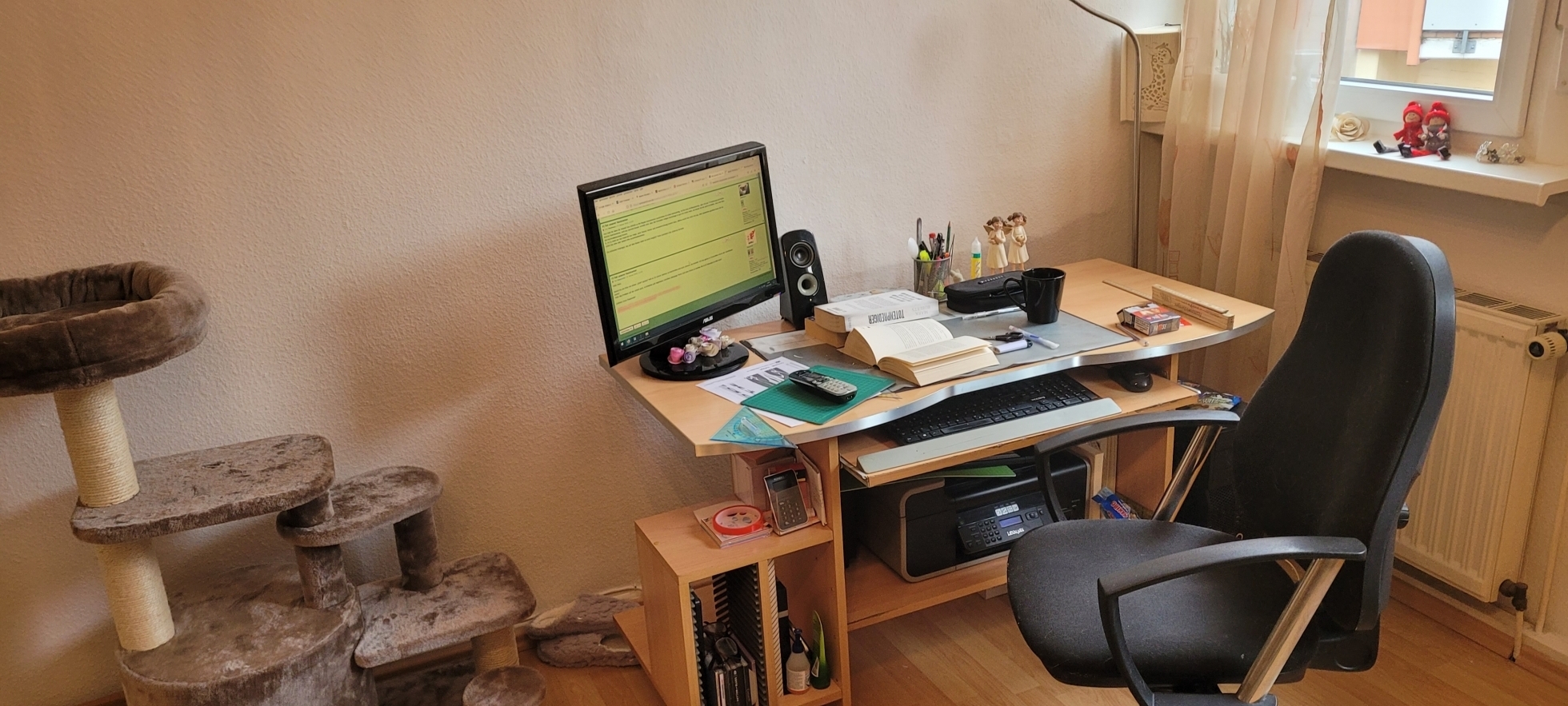 Rechts vom Schreibtisch: gerade mal 30 cm Platz + Heizung + Fenster + Stehlampe, die ständig benötig wird