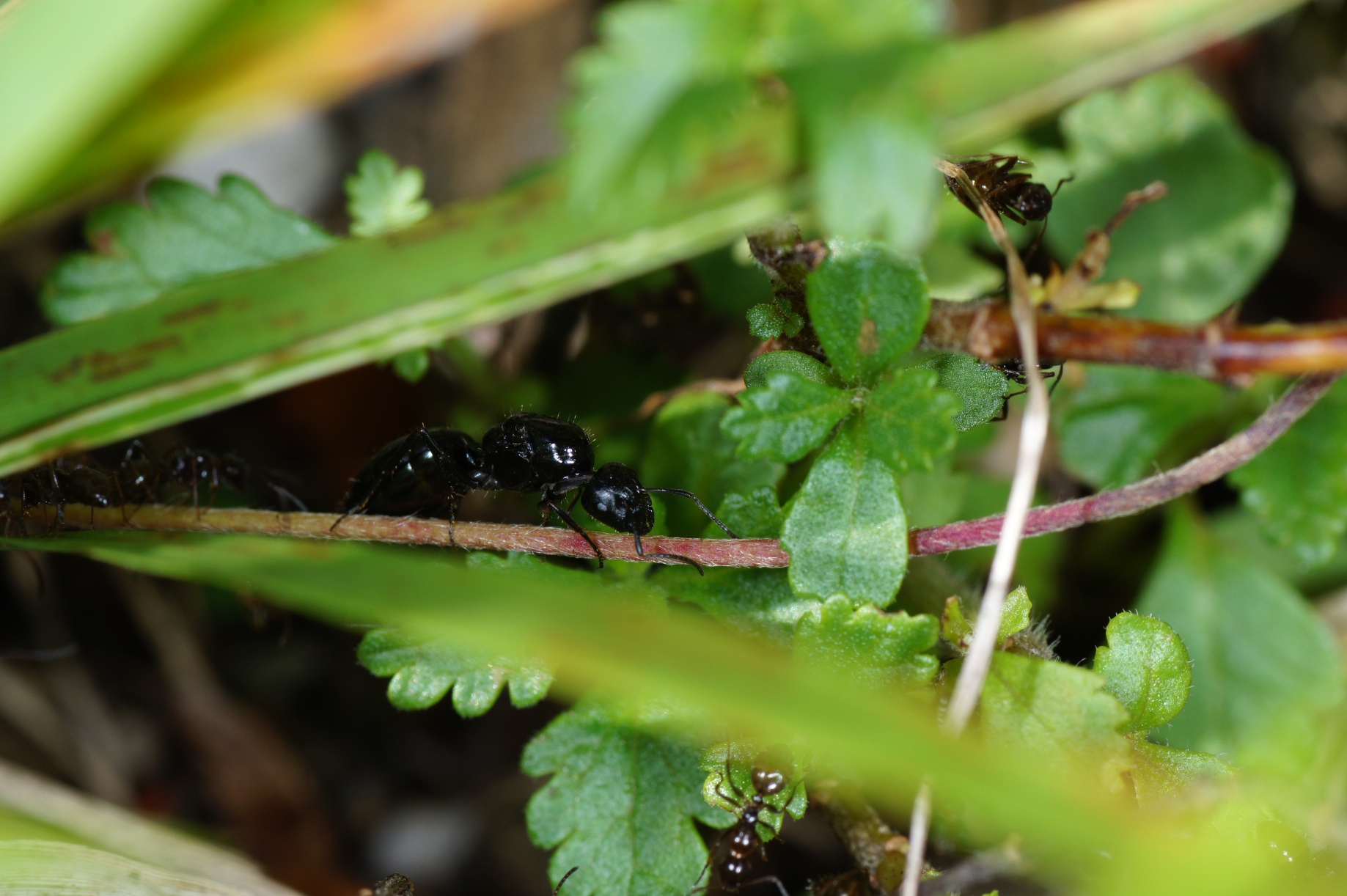 a) C. piceus ist beim Furagieren in einem gleichmäßigen Tempo unterwegs, nur bei Gefahr kann sie blitzschnell reagieren. Sie versucht den festen Boden stets zu meiden und bewegt sich vorwiegend über Gräser/Blätter vorwärts. Das Auslegen einer Pheromonspur erfolgt offenbar (wegen der komplizierten Wegwahl?) nicht durchgehend, daraus folgt, dass nachfolgende Ameisen wiederholt Gräser auf und ablaufen, zwischendurch die falsche Richtung einschlagen usw. Ein enormer Zeitverlust, der sich bei vorhandener Konkurrenz negativ auswirkt.