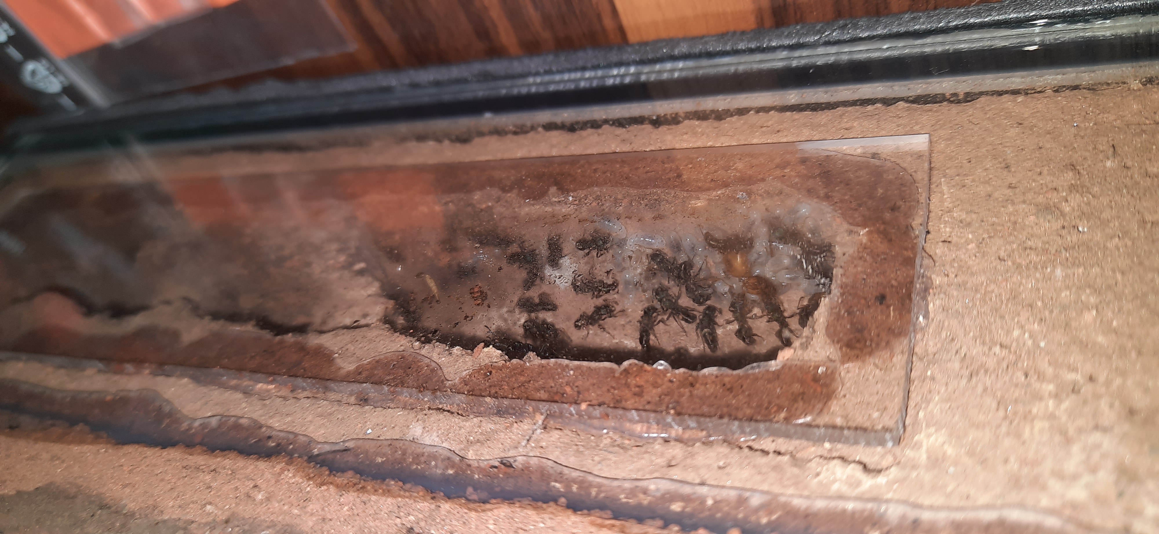 Sie können an GlaswĂ€nden nicht hochlaufen, das stimmt und habe ich auch öfters beobachten können wie die Arbeiterinnen keinen Halt finden. Im Augenwinkel habe ich die letzten Tage aber beobachtet, dass die kleine Silikonnaht als Kletterhilfe dient. Einen Deckel inkl. Rahmen habe ich auch drauf. Nun gut! Weiter ĂŒberlegen...