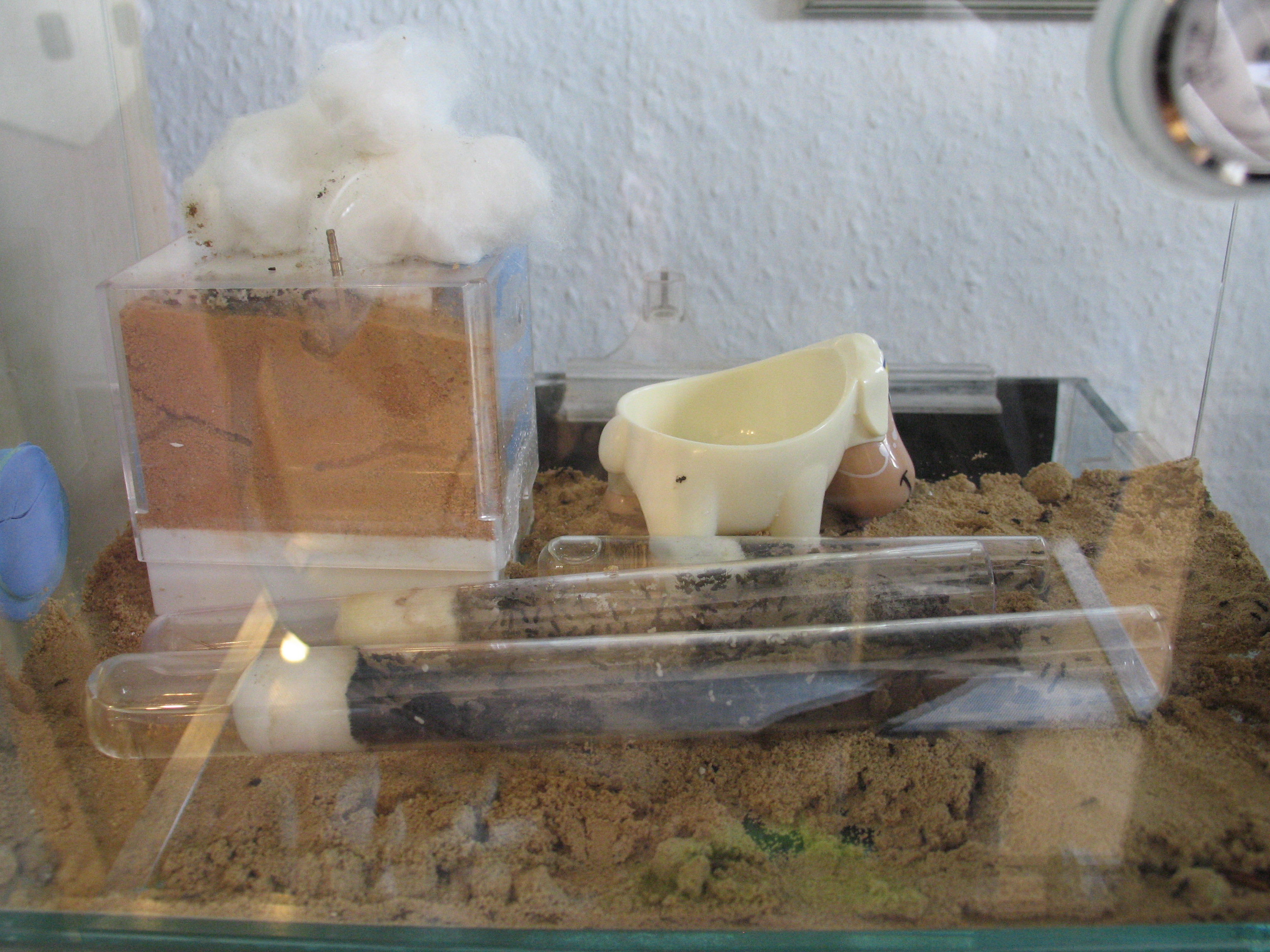 Die Tapinoma waren eh früh in die Kälte gegangen. Allerdings bewohnen sie die Arena, alle Reagenzgläser, das 3D-Nest und zum Teil auch die Farm mitsamt Schlauch gleichermaßen. Ich frage mich, ob ich bei denen etwas falsch gemacht habe, weil ich ja auch seit ihrer Ankunft keine