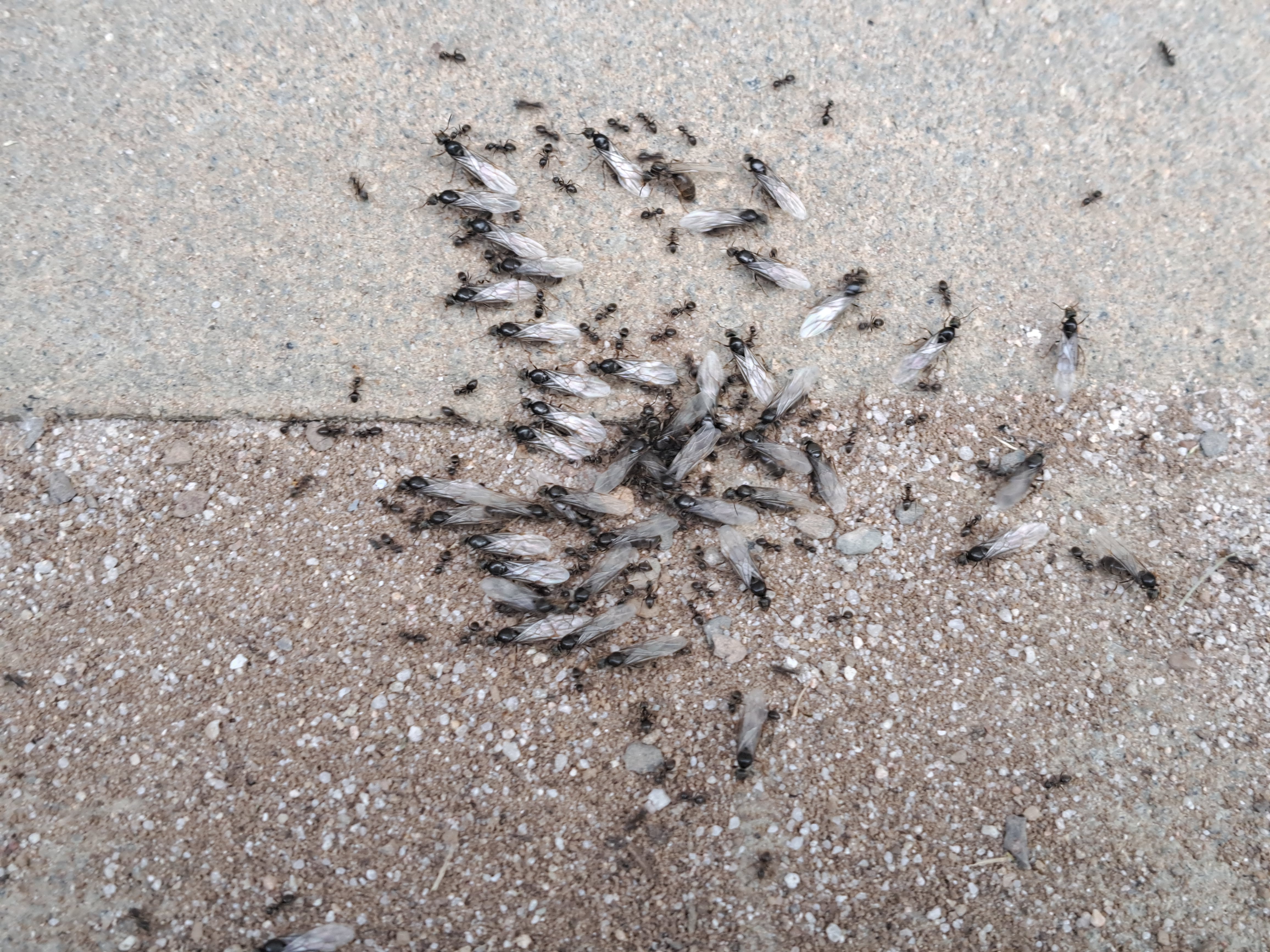 Hunderte, wenn nicht tausende Alate in der Luft und stellenweise etliche dealate Gynen auf dem Boden. Auf meinem Rückweg sah ich auch über anderen Wiesen noch letzte Schwarmaktivität. Nach den endlosen Regenfällen der letzten Tage und auch letzter Nacht müssen die Nesteingänge wirklich fix wieder geöffnet worden sein. Selten so einen nervtötenden Rasenmäher gehört.