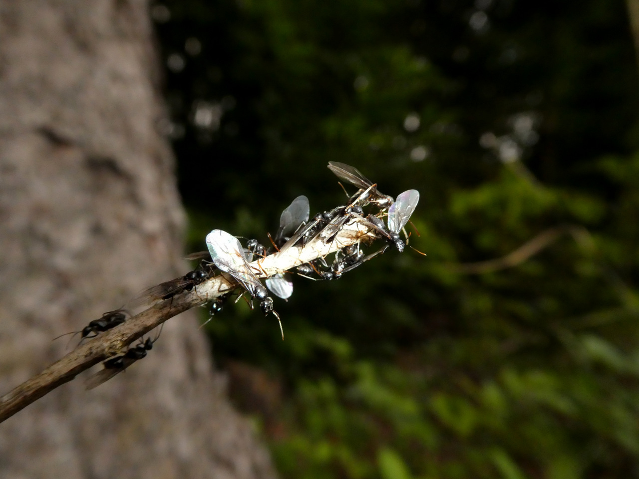 Bei Lasius fuliginosus herrschte auch ziemliche Aufregung, aber ich sah nur wenige Alate davonfliegen. Überhaupt habe ich bei denen nie ein massenhaftes Abfliegen beobachten können - immer nur vereinzelte Tiere, dafür aber über einen sehr langen Zeitraum.
