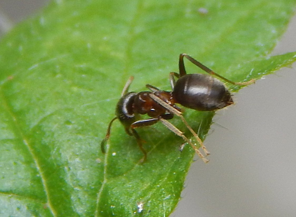 Auf meiner Terrasse 66450 Höchen, direkt am Wald - im Pflanztopf mit Brennessseln sind seit ein paar Wochen einige Ameisen unterwegs... zwischen 5 und 7 mm in etwa, teils sind auch die Blätter zusammen geklebt, allerdings nicht wie im letzten Jahr durch Raupen. Sie kümmern sich um ihre Blattläuse, die meist an den oberen Bereichen sitzen. Könnten es schwarze Wegameisen sein?