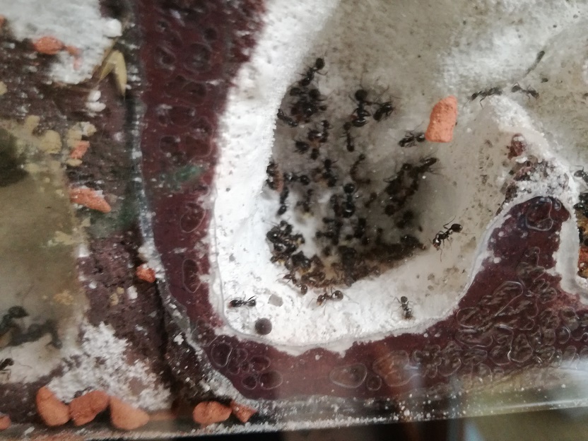 Den Tausendfüßler hab ich nie wieder gesehen. Milben sehe ich bewusst keine mehr. Das Formikarium wird an sich sehr trocken gehalten, die Ameisen tragen selbst das Wasser aus Reagenzgläsern ein.