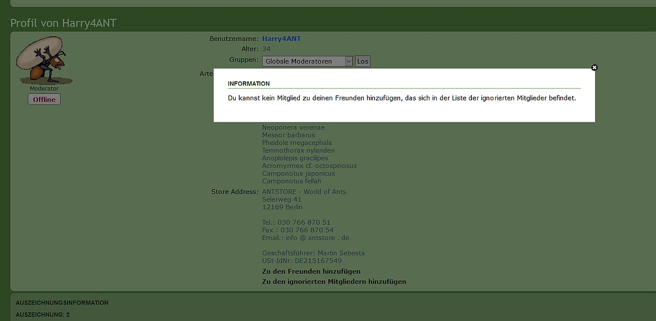 Ich habe versucht, Harry4Ant einfach eine Freundschaftseinladung zu schicken, das ist aber nicht möglich und ich bekomme folgende Meldung: Dabei ist meine Liste der ignorierten Mitglieder weiterhin leer: Ich habe versucht Harry manuell zu ignorieren, um ihn dann von der Liste zu nehmen, das funktioniert aber auch nicht, er taucht auf der Liste nicht auf, selbst wenn ich auf ignorieren drücke.