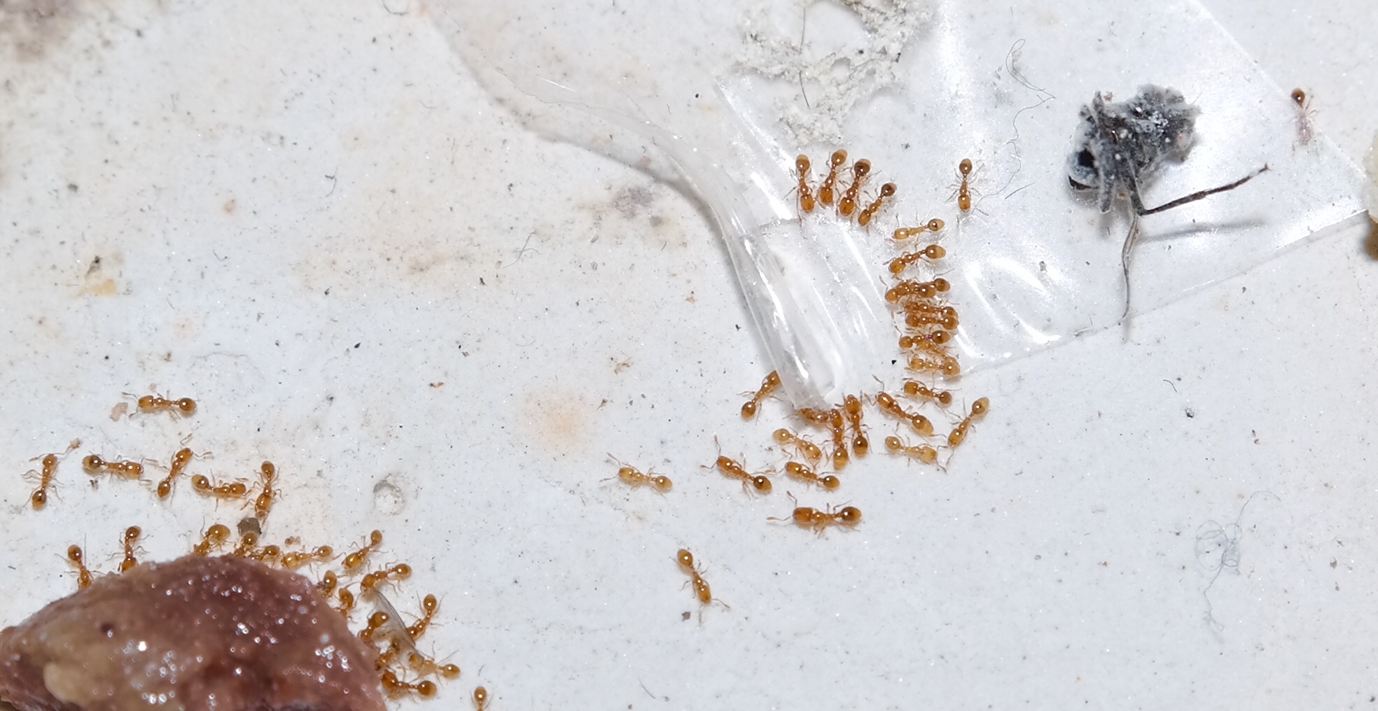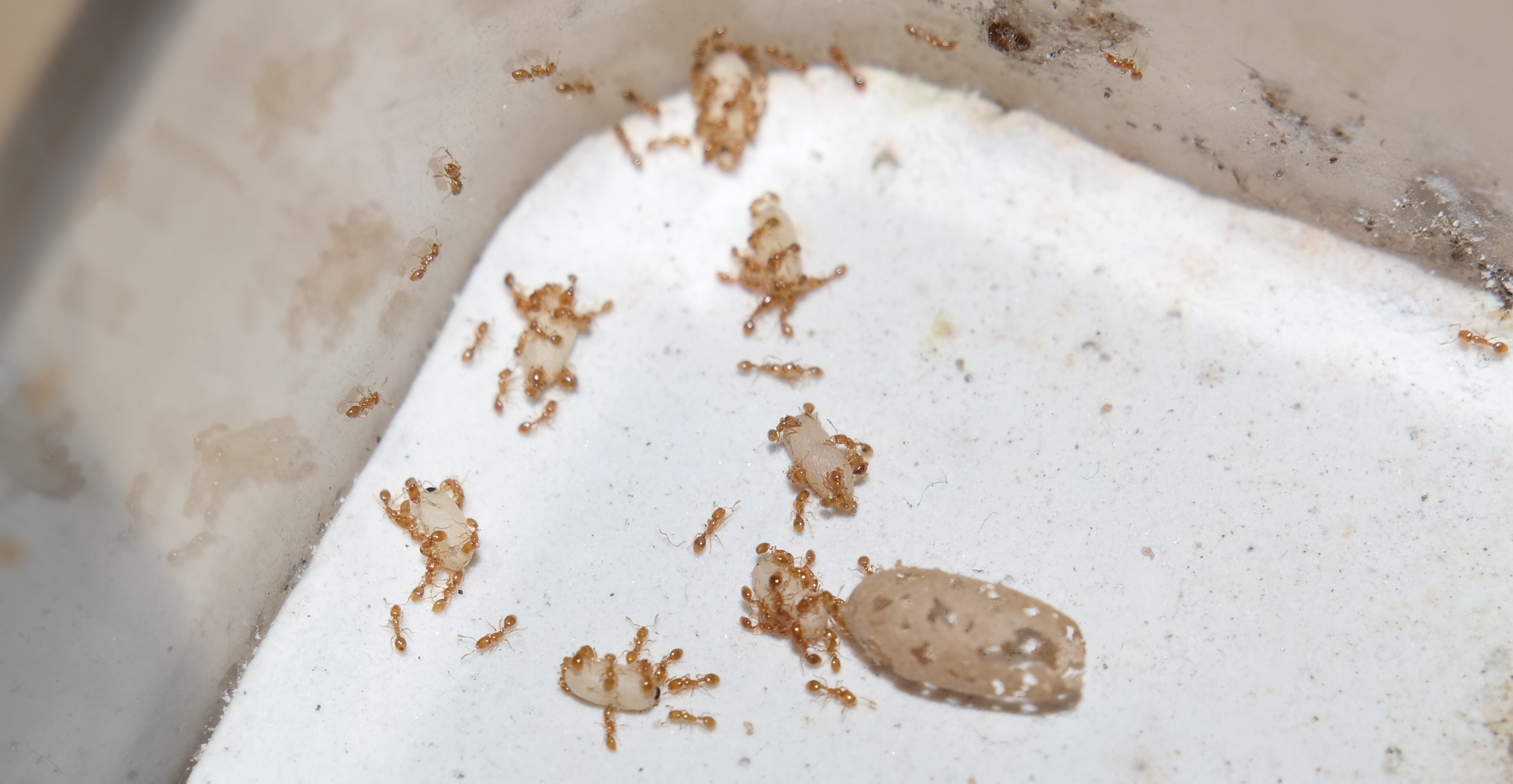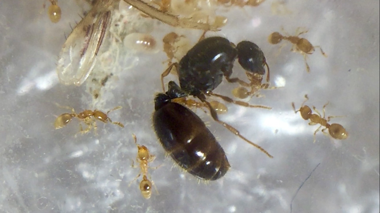 Insbesondere Zuckerwasser wird deutlich mehr angenommen als ich erwartet hatte. Die kleinen Tiere nehmen beinahe genausoviele Kohlehydrate zu sich, wie eine zahlenmĂ€Ăig gleich groĂe Lasius niger Kolonie