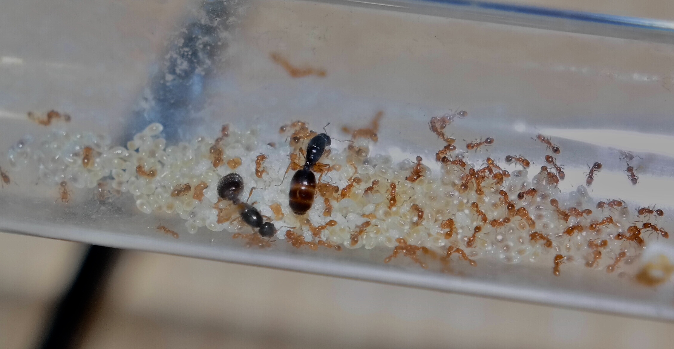 Die beiden gemeinsam grĂŒndenden Gynen vertagen sich nach wie vor super, und ihr Larvenberg ist, verglichen mit dem der Anderen, deutlich gröĂer.