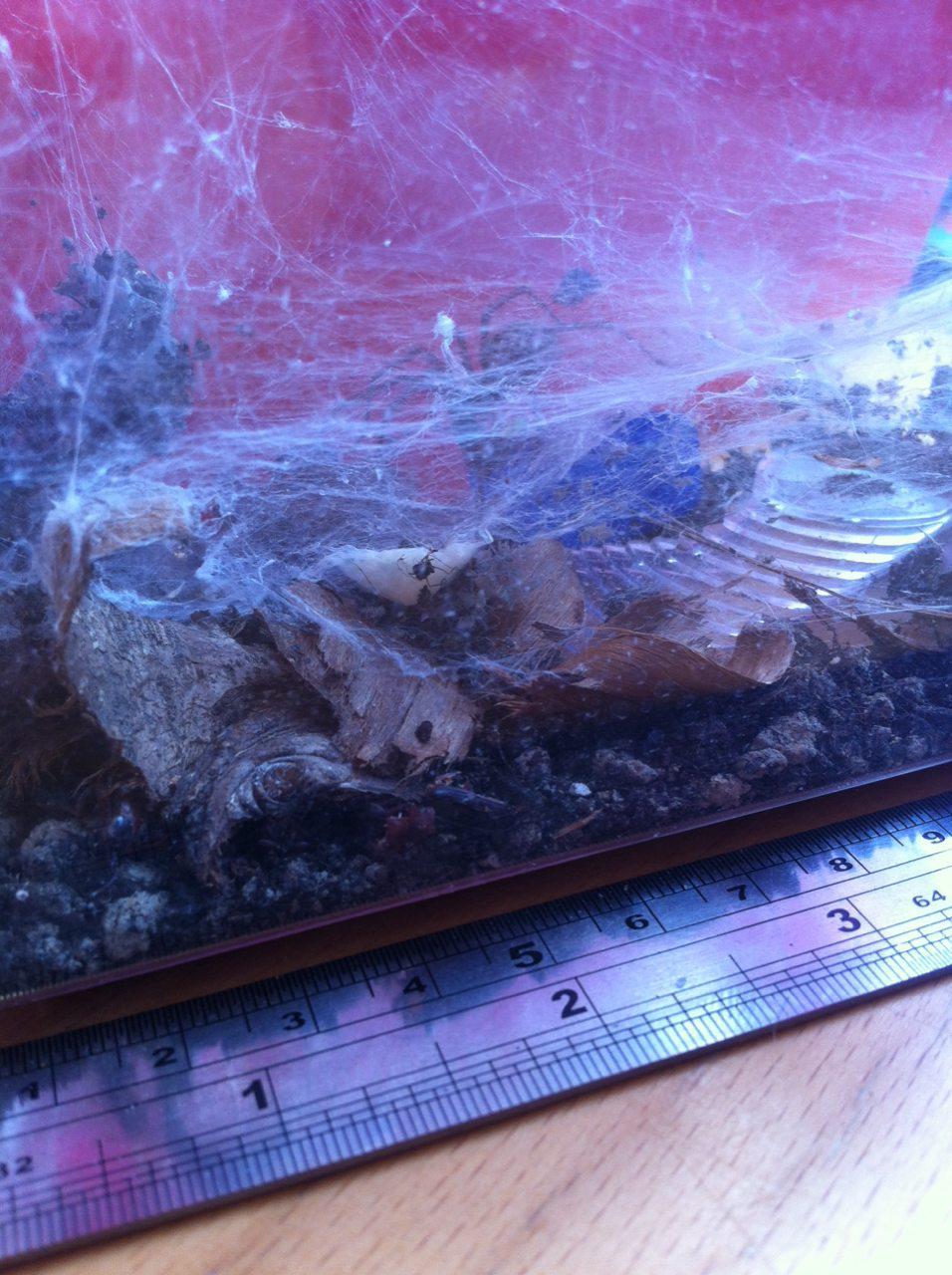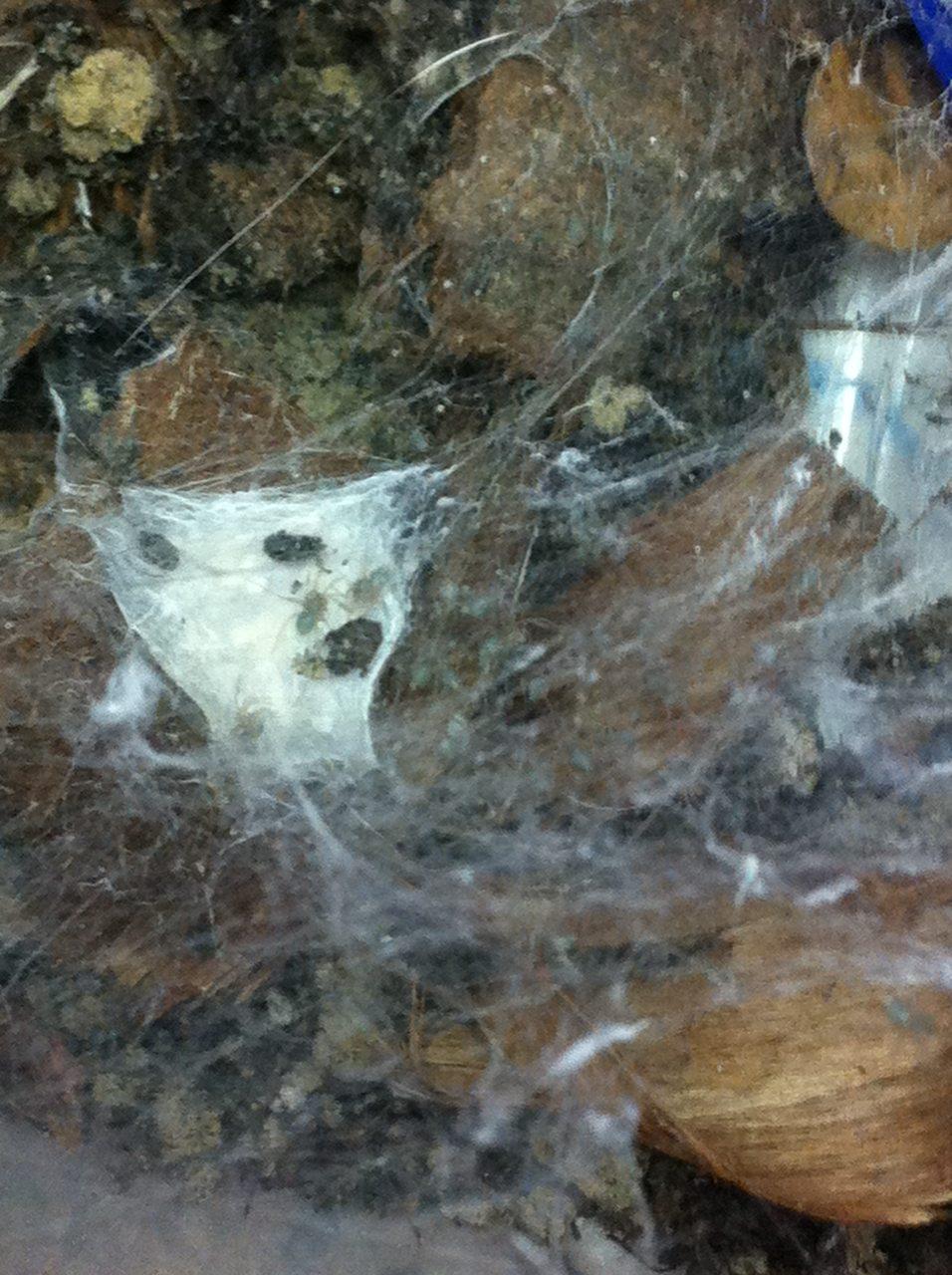 Auch ausgehĂ€rtete MehlwĂŒrmer finden bei ihr Verwendung. Der Panzer wird einfach geknackt. Die Winkelspinne hat merkwĂŒrdige Gebilde gebastelt. Es handelt sich um zwei dicke knubbelige SpinnenwebenknĂ€ule. An dem einen hat sie Erde befestigt. Das andere schwebt frei im Raum. Meine Vermutung (Hoffnung) ist, dass es sich um Eierpakete handelt.