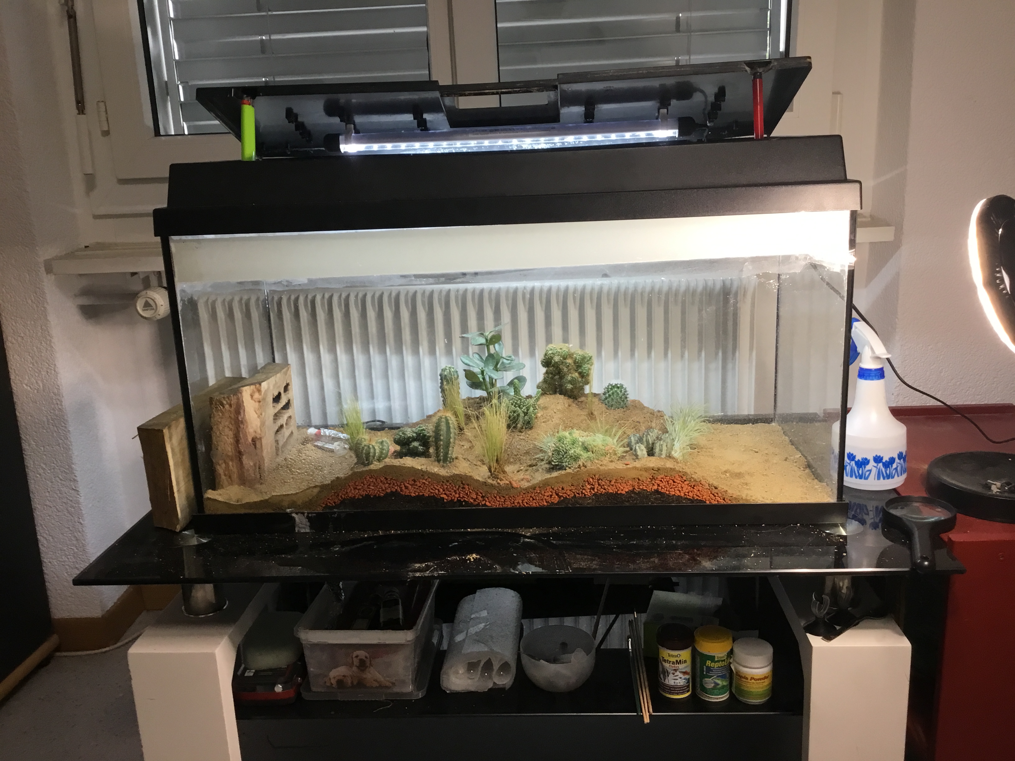 Offenbar mag sie den Sand nicht, springt äusserst geschickt von Stein zu Pflanze usw, eben sprang sie vom obersten Blatt vom Geldbaum auf den Felsenkaktus, ca 8 cm weit! Für ein Tier dass keine 5mm misst ne beachtliche Leistung