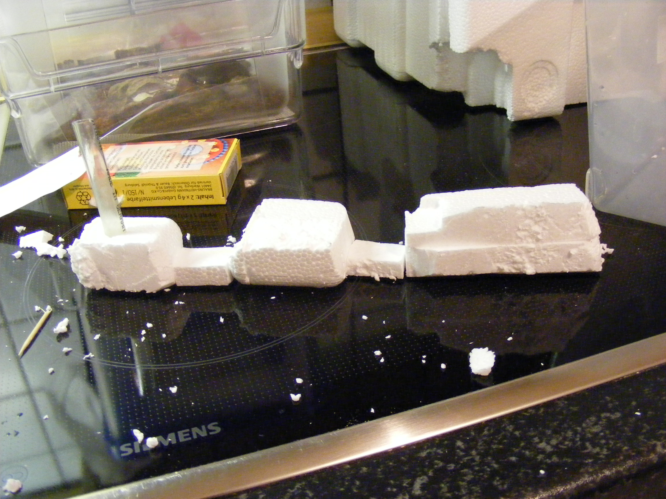 [/font][font=Arial]Dann den Gips in die Box gießen, trocknen lassen, aus der Box holen, Styropor entfernen und fertig.[/font]