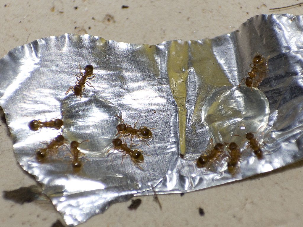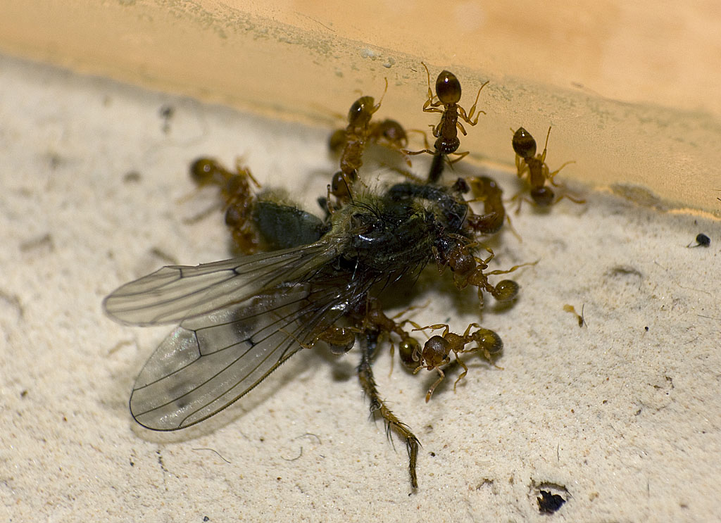 Bild 1, 3, 4: Arbeiterinnen von Kolonie #1 beim zerlegen der Mücken