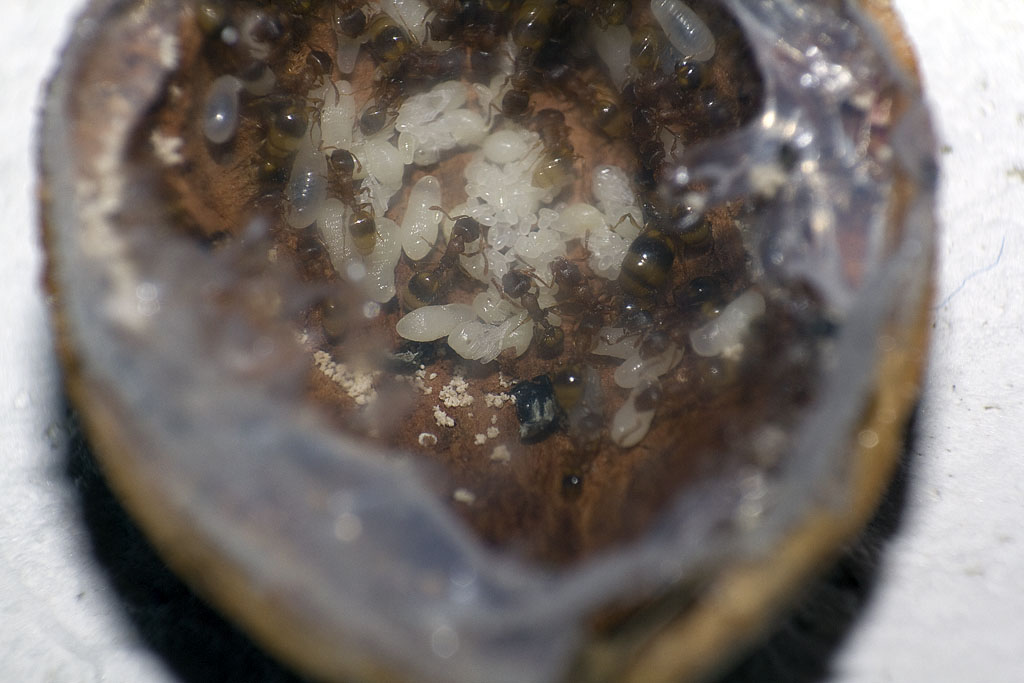 Kolonie #1 befindet sich in einer Rocher Box, die einen Boden aus einem Spachtelmasse-Lehm-Gemisch hat. Sie wohnt weiterhin in ihrer Eichel, wobei ich heute eine CF-Karten Schutzhülle als Nest angeboten habe. Mal schauen ob sie es für gut empfinden. Ansonsten werde ich mich bemühen ihnen ein Kork- oder Holznest zu bauen.