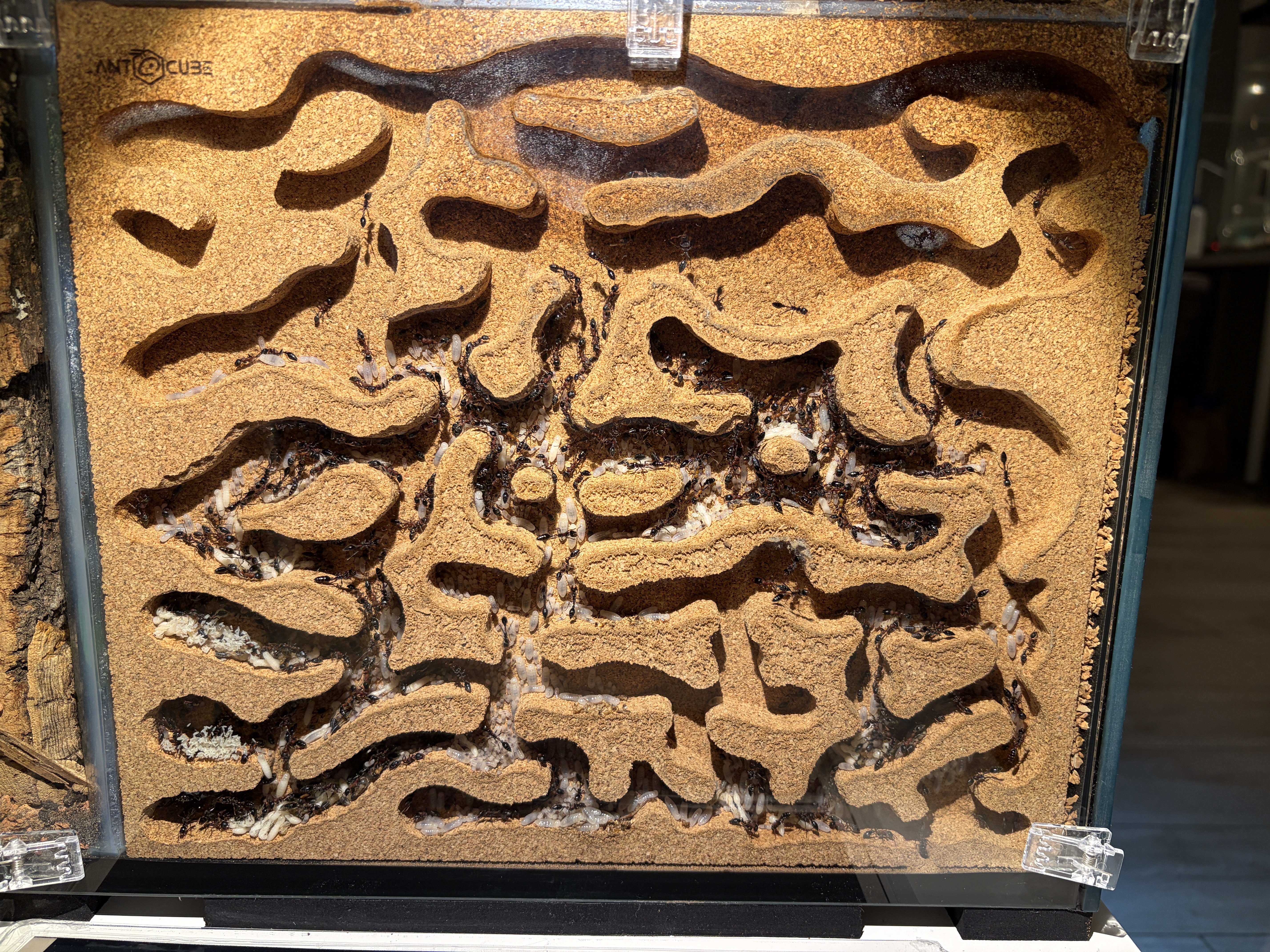 Nach lÀngerer Zeit muss das Formicarium wieder einmal gereinigt werden. Es gestaltet sich mittlerweile sehr schwierig, denn die Anzahl der Arbeiterinnen in der Arena ist konstant bei 30-50 Ameisen.