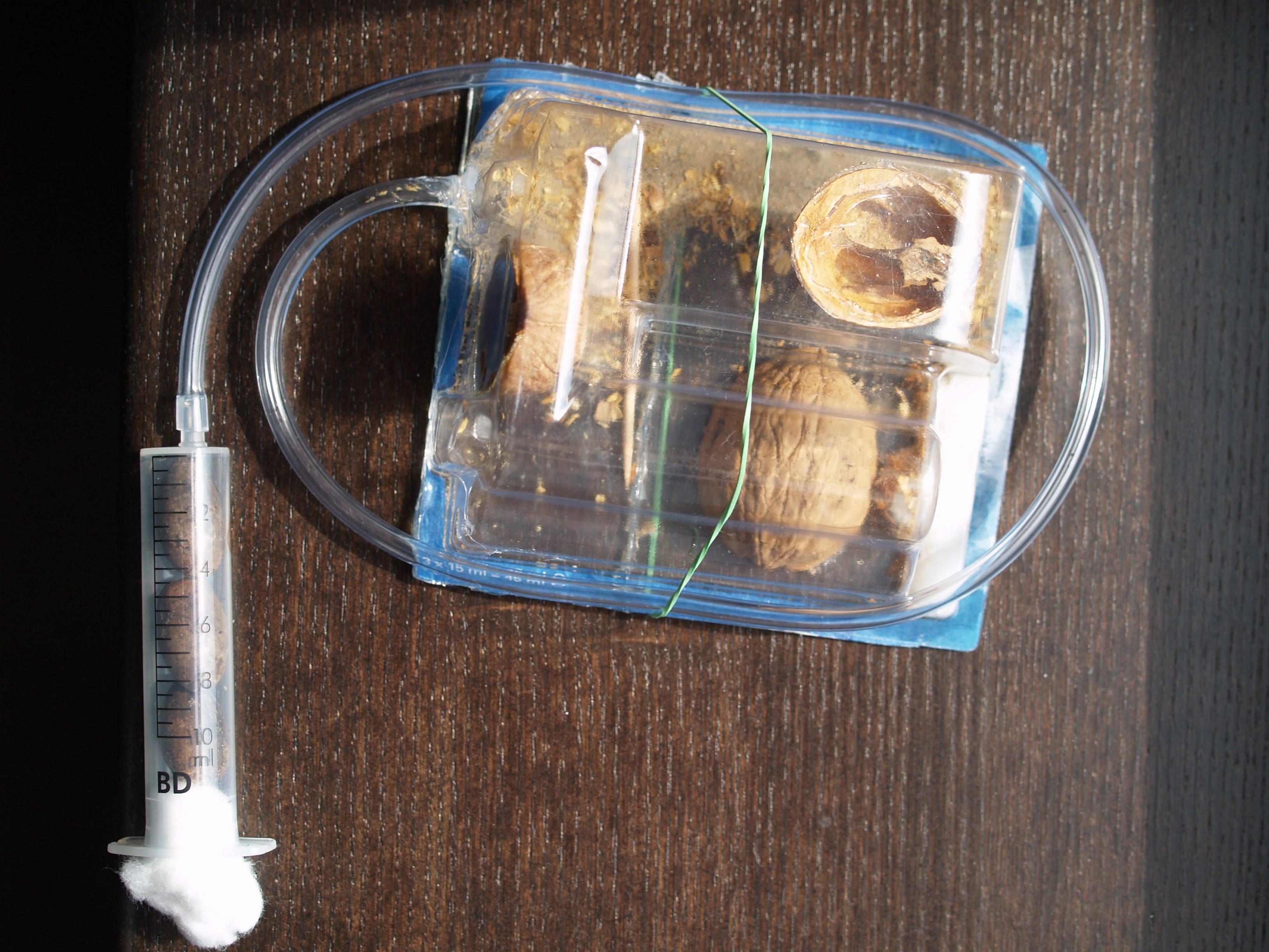 Hab mir nun ein kleines Formi für die kleinen gebaut mit drei Walnusshälften an den Wänden. Die Eicheln habe ich in so eine Spritze getan in der Hoffnung, das sie umziehen werden.
