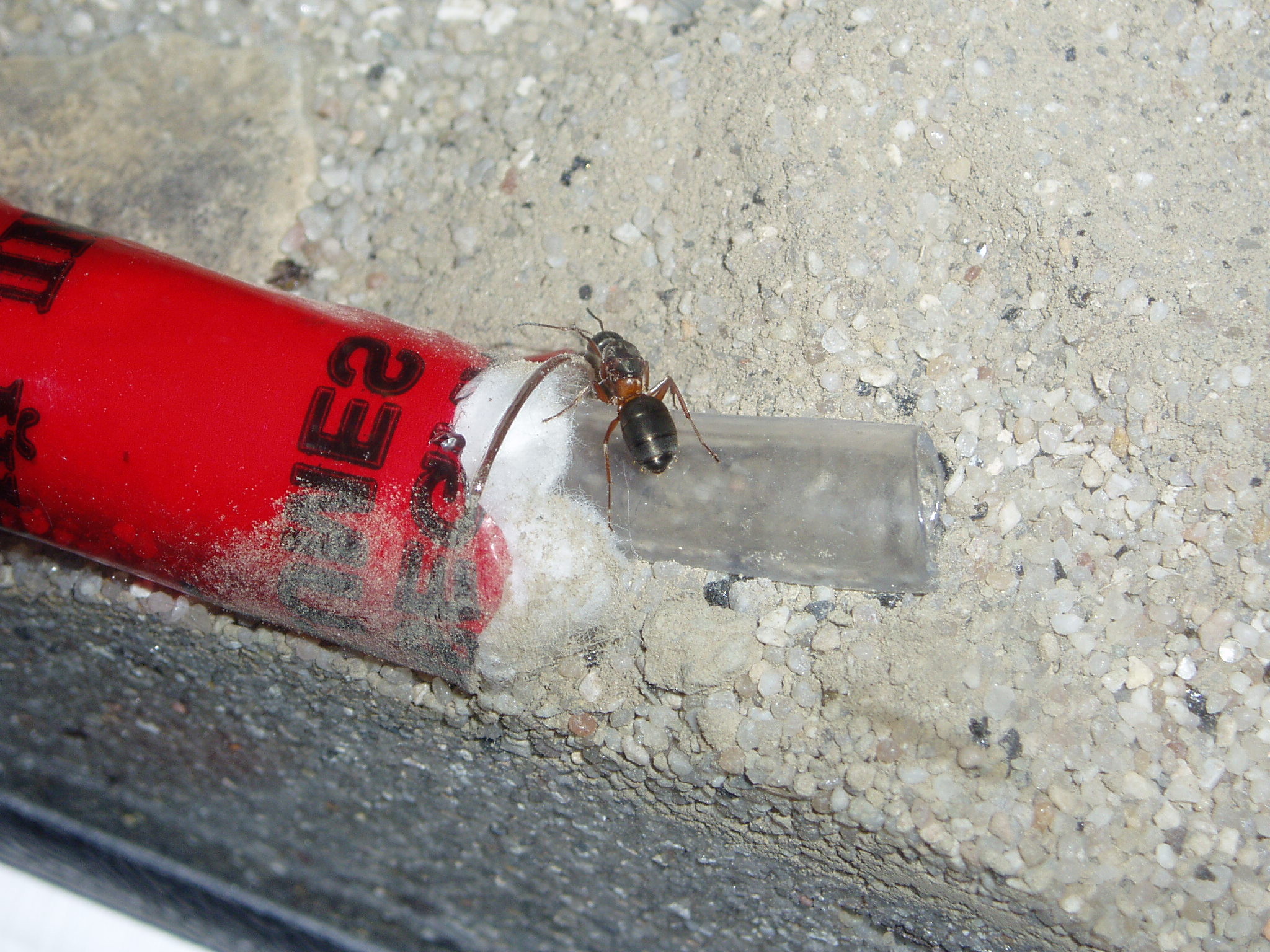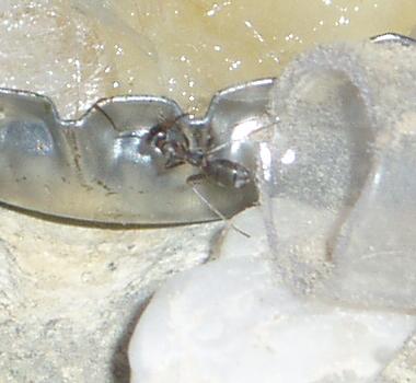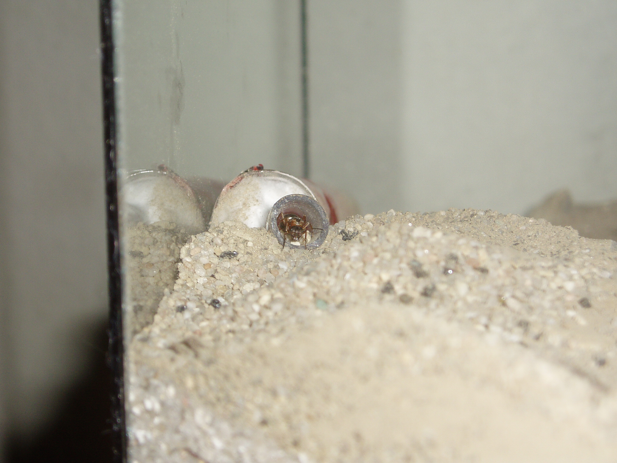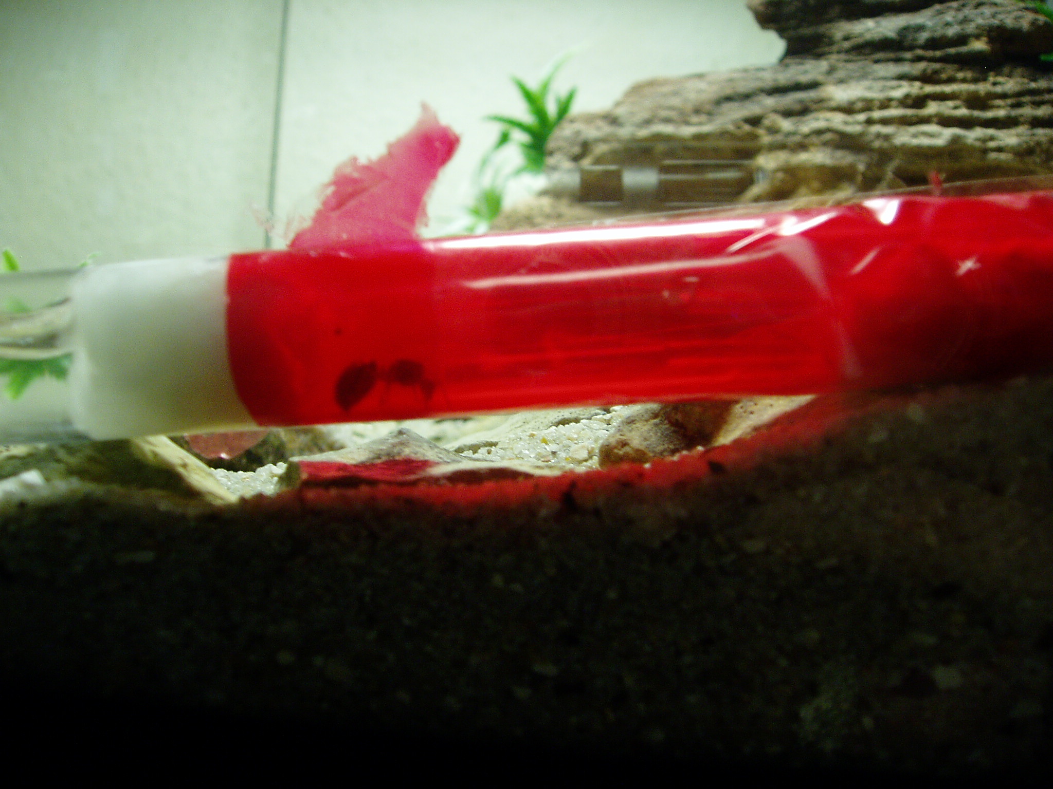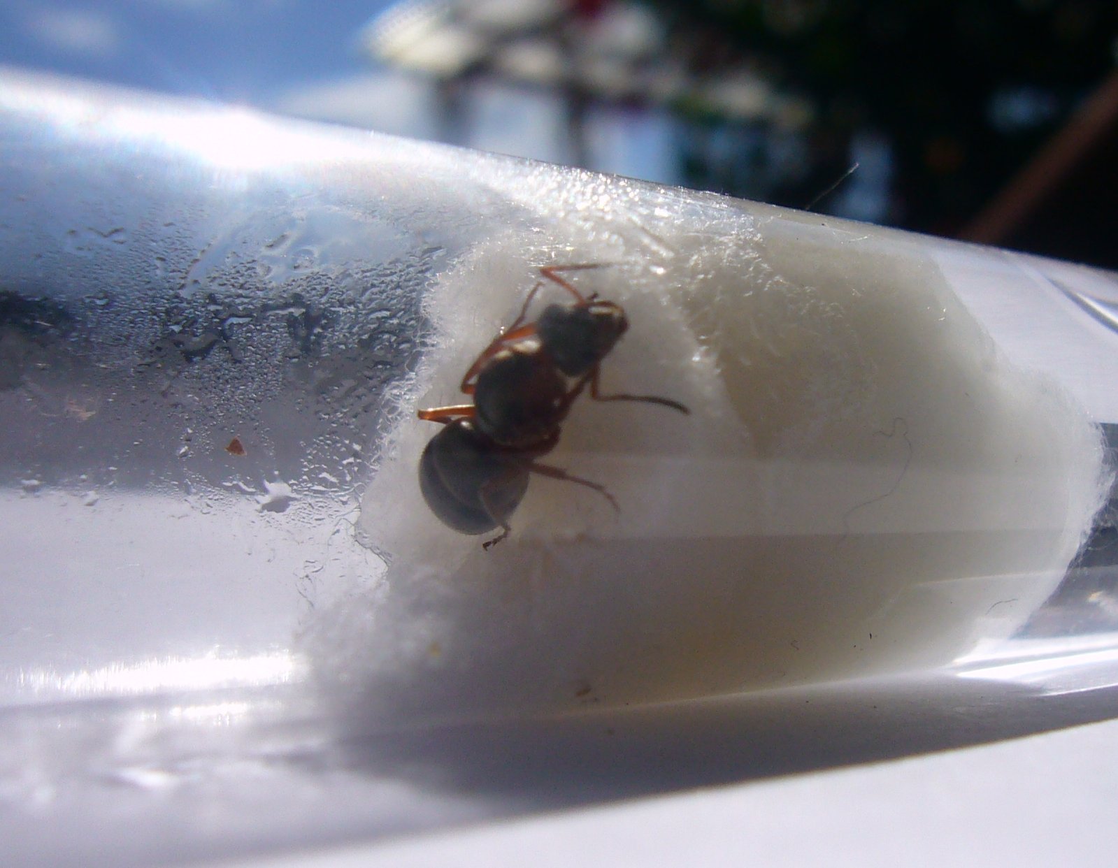 Brut in alles Stadien vorhanden ca. alle 1-2 Wochen schlüpft ein neuer Trupp von ca. 5-10 Arbeiterinnen. Die Gesamtzahl schätz ich auf 40-50, das Reagenzglas, in dem sie immernoch wohnen, ist am Boden und den Seitenwänden fast vollständig bedeckt. Das Wasser ist längst vertrocknet und die Watte ist zu einem undeutbaren schwarzen Klumpen zusammengeschrummpelt. Das schwarze hielt ich zuerst für Schimmel. Dieser "Schimmel" hat aber schon vor der