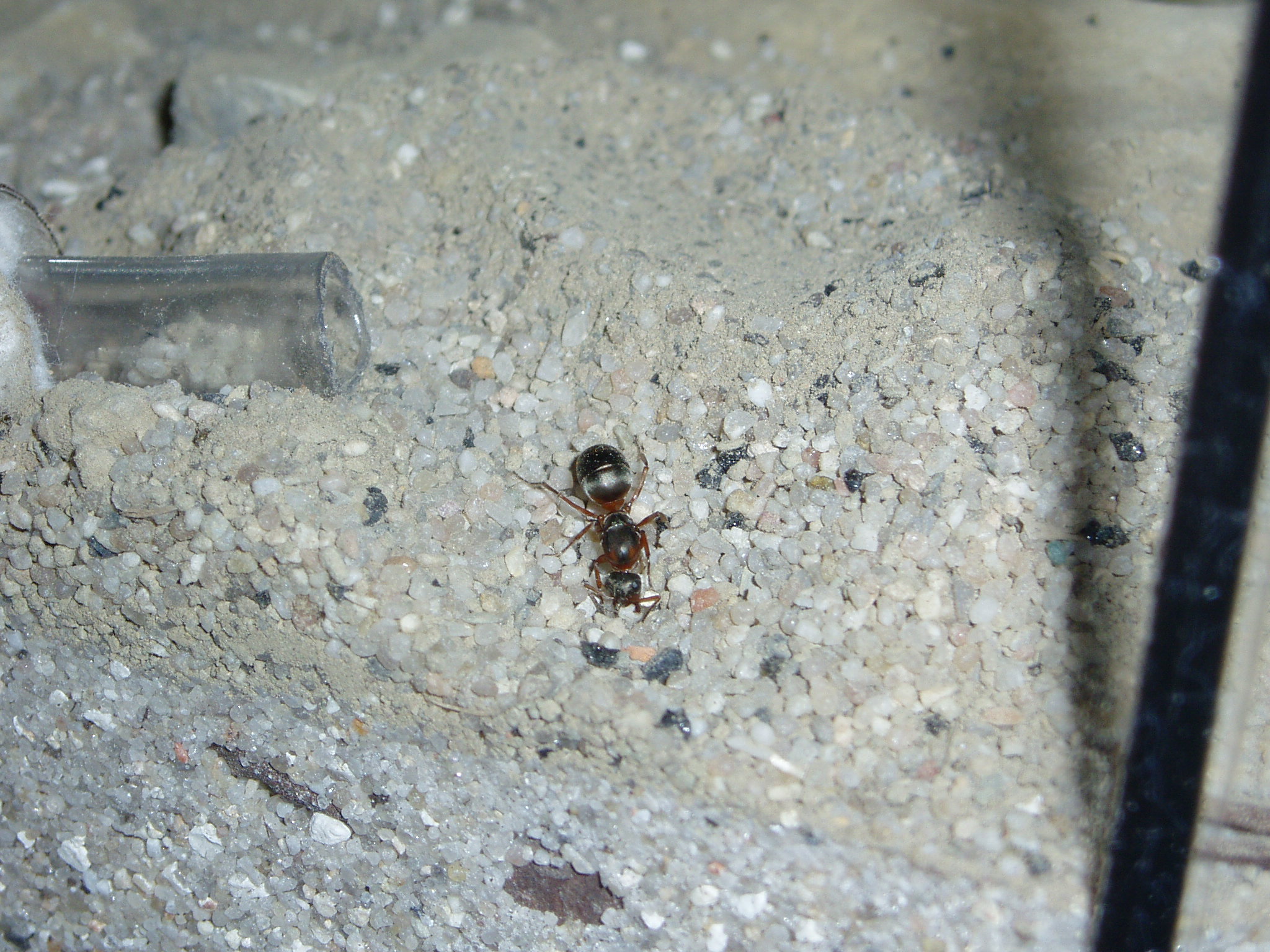 Brut sind nur selten ausserhalb des Nestes zu sehn. Diese "größeren" (ja eigentlich "normal" großen) Arbeiterinnen haben weniger Probleme Nahrung zu transportieren oder mit Gewalt durch das Eingangsröhrchen zu zerren, wenn es einer zu schwierig wird, kommen nach einger Zeit meist andere und helfen beim transportieren oder zerlegen zB größere Fliegen auch teilweise vor dem Transport. Diese Hilfe scheint sich jedoch mehr zufälllig zu ergeben, nach einiger Zeit stoßen einfach mehr und mehr Arbeiterinnen auf die Futterstelle. Ich konnte nicht bewusst beobachten, dass Arbeiterinnen dafür direkt rekrutiert wurden. Vielleicht war es auch durch Pheromone koordiniertes Teamwork, das kann ich natürlich nicht beurteilen^^. Maximal habe ich 5 Arbeiterinnen zur gleichen Zeit beim Transportieren einer Fliege beobachtet.