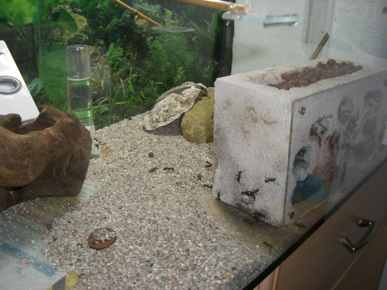 Auf den Bildern sieht man das Formicarium wie es jetzt ist. Den Wall vor dem Eingang des Y-tongs haben sie selber gemacht und sind jeden Tag dabei ihn zu vergrößern