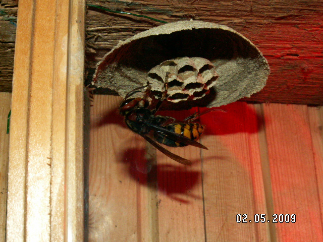 Vor einigen Tagen begann eine Hornissenkönigin mit dem Bau eines Nestes in meiner Gartenlaube. Sie hatte sich eine Stelle unterm Dach auserkoren, von der sie durch die stest offene Tür ein- und ausflog.