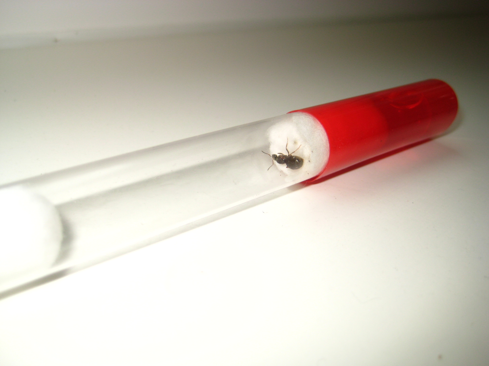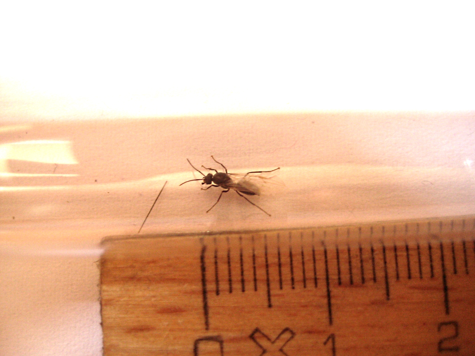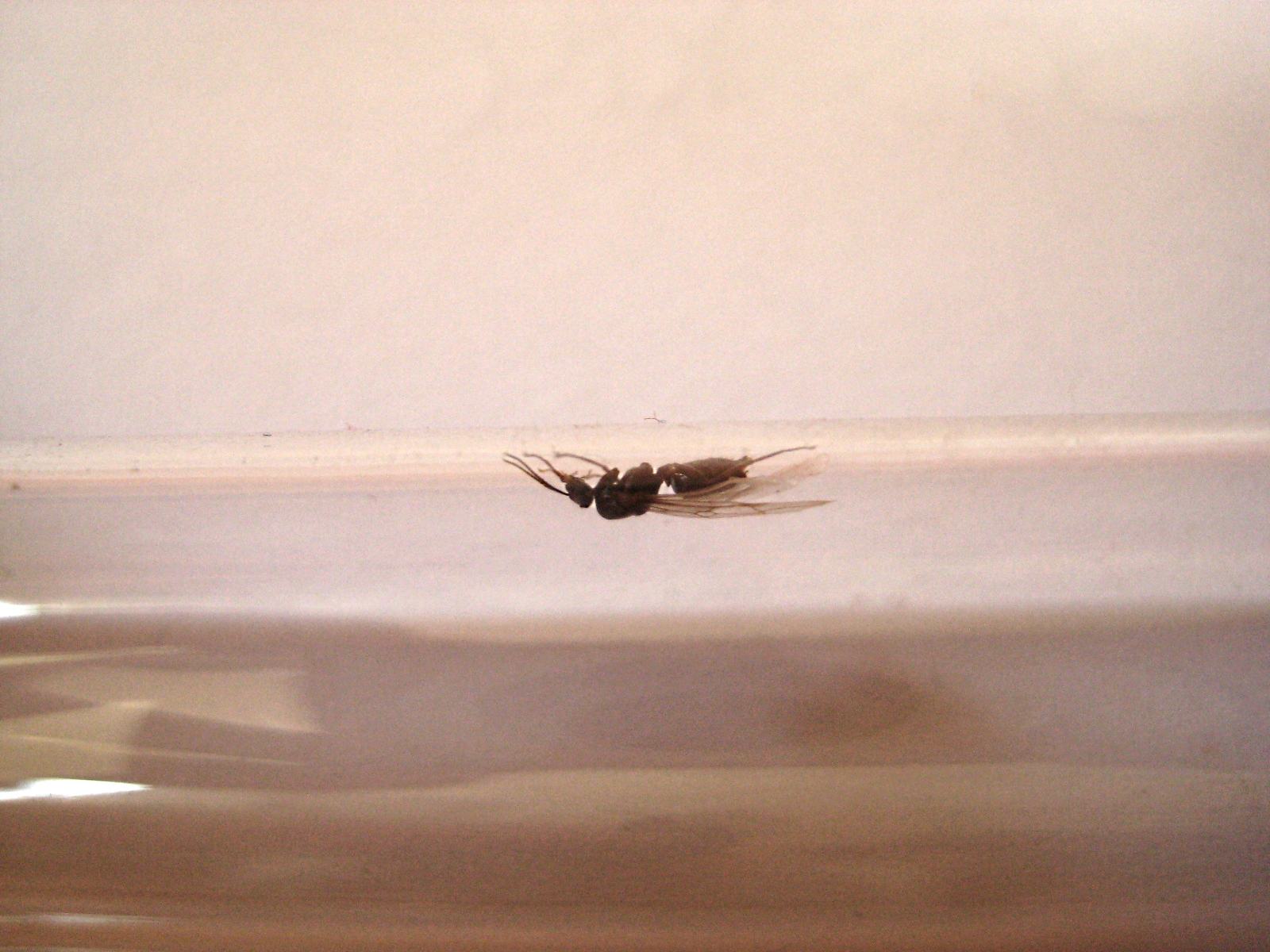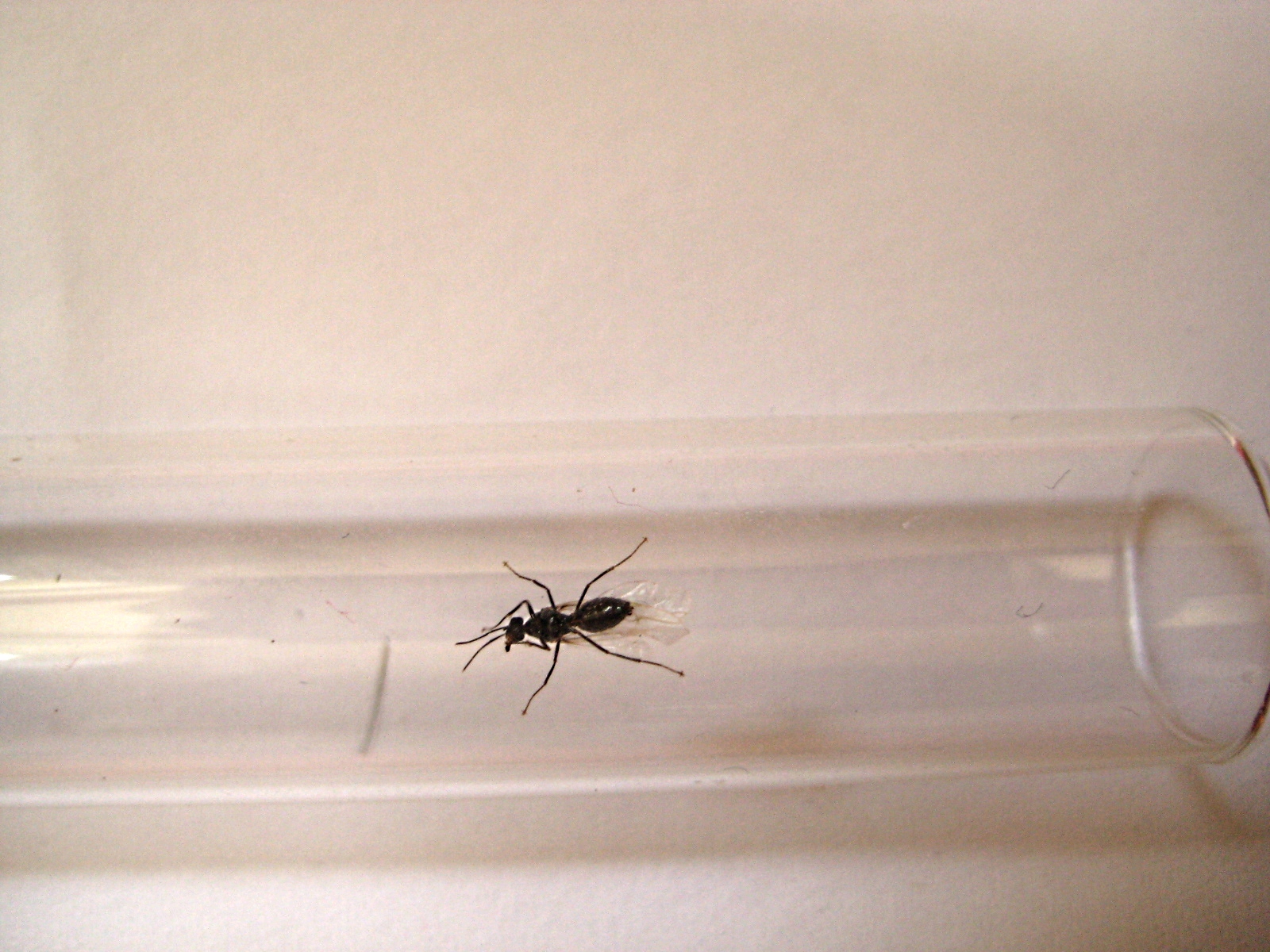 Die Gyne kam direkt auf mich zu, Funddaten sind die obigen, es handelt sich um eine Lasius Art. Die Gyne weißt eine bräunliche Färbung auf, im Sonnenlicht weißt ihre Gaster eine braune Pubeszens auf. Die Unterseite der Gyne habe ich noch nicht sehen können sie hängt an der Watte. Die Größe liegt bei ca. 9mm.