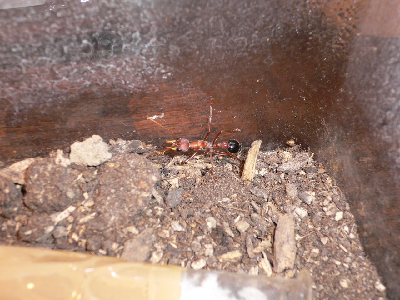 Was krabbelte da herum? Eine Myrmecia pavida Gyne :eek::eek::eek:. Ich nehme an, dass sie entweder einem Halter ausgebüchst ist, oder Jemand sie aussetzte, wobei ich eher denke, dass sie ausgebüchst ist. Mann, was für ein .... mus den das sein? Ich meine Myrmecia pavida sind ja nicht die extremen Ausbruchskünstler. Naja ich sage dem/ der unbekannten Spender/in danke, so etwas findet man wirklich nicht alle Tage.