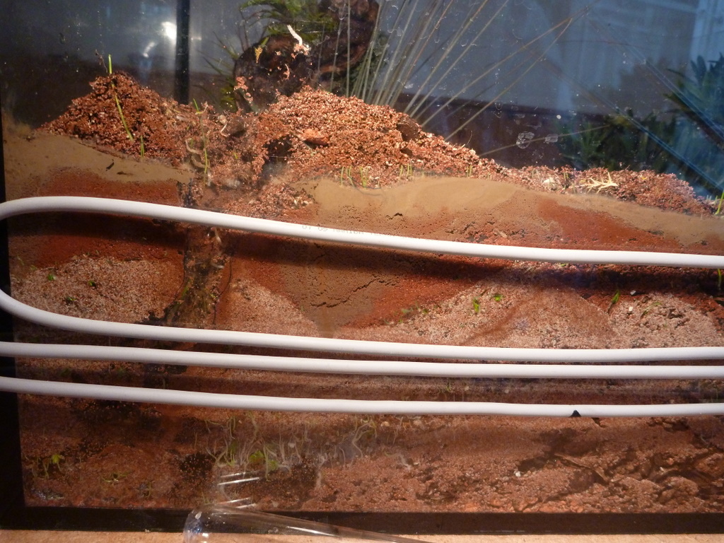 Im unteren Bildteil sieht man die Plexiglasscheibe, welche ich ĂŒber die gesamte LĂ€nge des Beckens eingebaut und eingeklebt habe. der Bereich, wo die Ameisen graben sollen ist in der Mitte etwas ausgebaucht (schlampige Arbeit) aber etwa 2 cm breit.