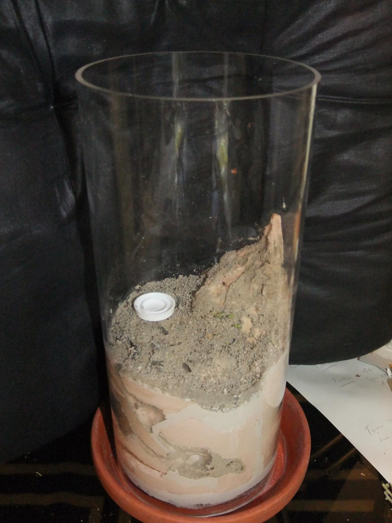 Nun habe ich mich vor kurzem an die Umsetzung gewagt. Ein groĂer Acrylzylinder musste her. (Heftig was die kosten.) Der wurde dann mit Gips gefĂŒllt um den Gips danach zu bearbeiten. Eigentlich insgesamt ein Arbeitsaufwand von maximal einer Stunde aber da ich vergessen hatte irgendein Schmiermittel in dem Zylinder aufzutragen musste ich den gehĂ€rteten Gips in mĂŒhevoller MeiĂelarbeit wieder raushĂ€mmern. Das hatte ich mir einfacher vorgestellt. Naja letztlich hat dann alles geklappt und ich bin mit dem Ergebniss recht zufrieden. Und das kleine Myrmicavolk scheint sich auch wohl zu fĂŒhlen.