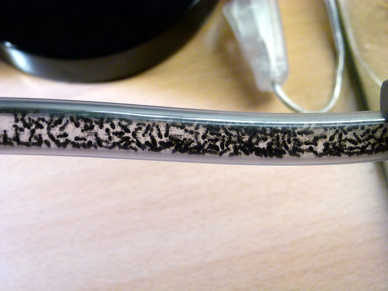 UrsprĂŒnglich war die Farm nur bis ungefĂ€hr auf die Höhe des schwarzen Flecks auf der rechten Seite befĂŒllt. Mittlerweile haben die Ameisen fast die komplette Scheibe verdeckt. Im linken Teil haben sie sogar Zwischendenken eingezogen. Wusste bisher gar nicht, dass die sowas können.
