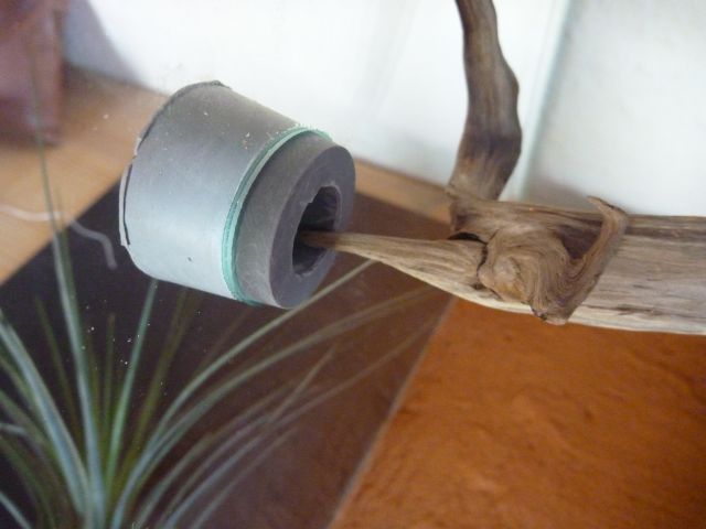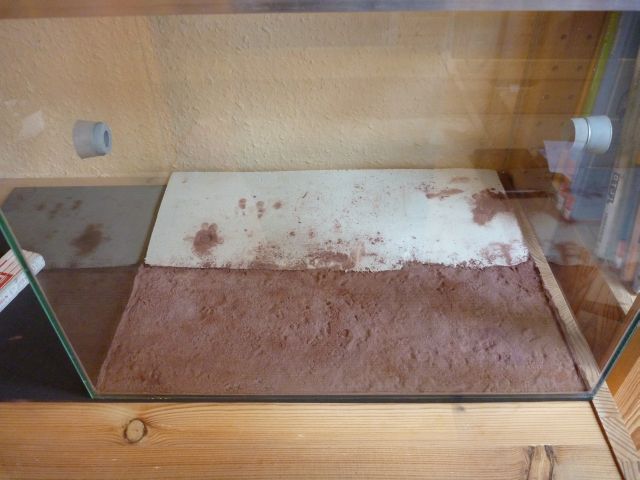 )Da ich jetzt das Problem hatte, dass ich den Deckel aufrgrund des Kabels nicht mehr so einfacht irgendwo ablegen konnte, habe ich an der Holzplatte des Regals ĂŒber dem Glasbecken eine Halterung angebracht, in der ich den Deckel befestigen kann. Als nĂ€chstes folgte dann die zweite Bodengrundschicht in orange (ocker).