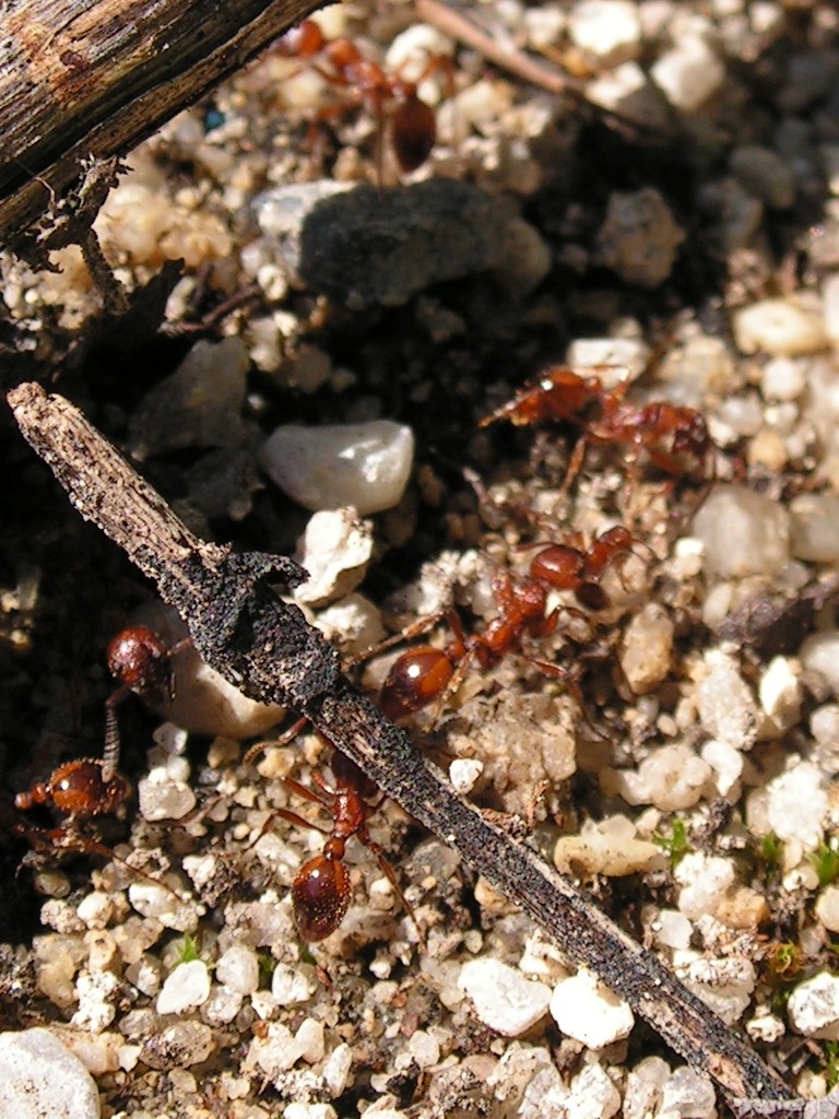 Jetzt kommen wir aber zu einem anderen Punkt: Wie sieht das VerhÀltnis von Manica rubida zu einigen Myrmica-Arten aus? Vor Jahren konnte ich beobachten, dass Myrmica-Arbeiterinnen immer wieder in ein Manica-Nest liefen und von den Manica-Arbeiterinnen prompt immer wieder herausgetragen und abgesetzt wurden. Da gab es schon auch einmal ein Gezerre, aber wirklich feindselig sah das VerhÀltnis nicht aus.