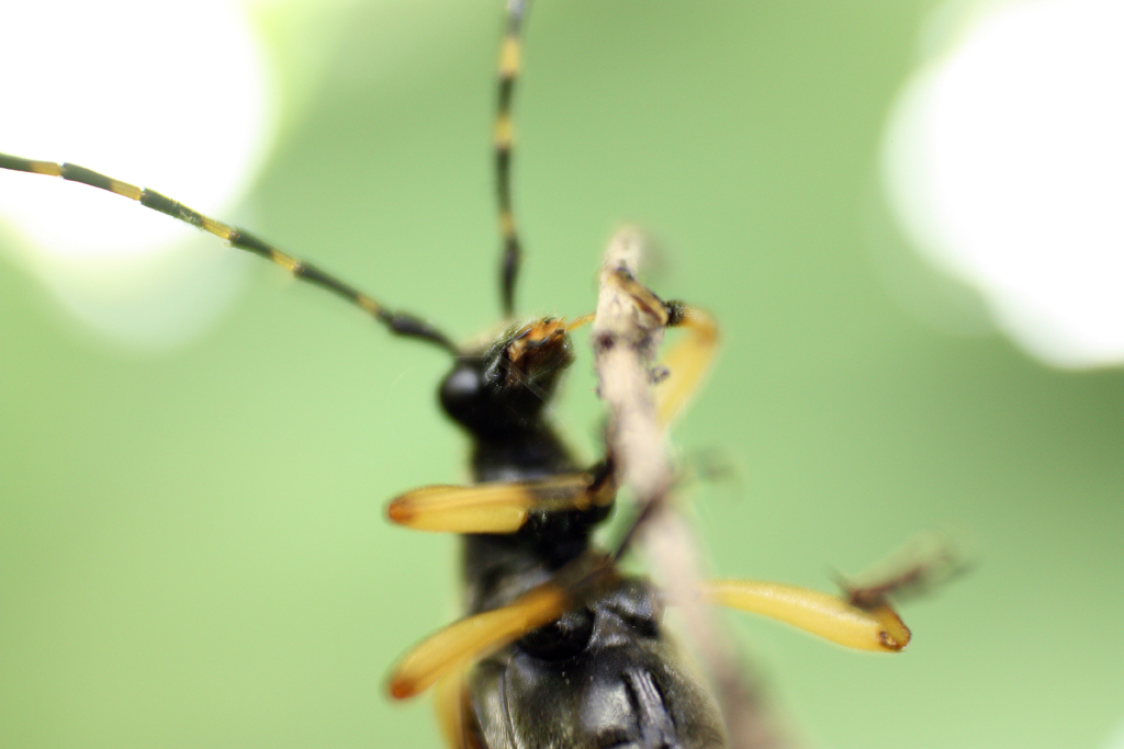 Foto 6: ein schwarzer Marienkäfer, leider etwas unscharf. Dafür spiegelt sich der Himmel auf seinem Rücken