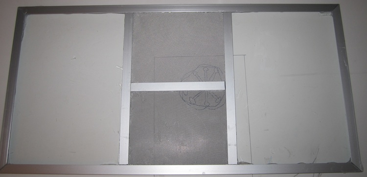 Rechts und links sind zwei Glasscheiben (30 x 20 cm) und in der Mitte ist 20 cm breite Gaze von einem Pfannenspritzschutz aus dem HaushaltswarengeschÀft.