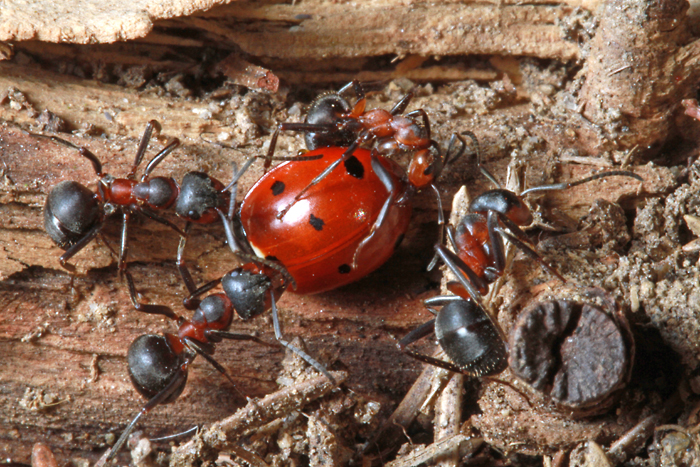 Interessant war zu beobachten wie die Tiere reagierten als sich ein Marienkäfer vor den Nesteingang verirrte. Im Nu war eine ganze Meute auf ihm , doch der Käfer preßte sich fest an den Boden und die Ameisen ließen auch gleich wieder von ihm ab.