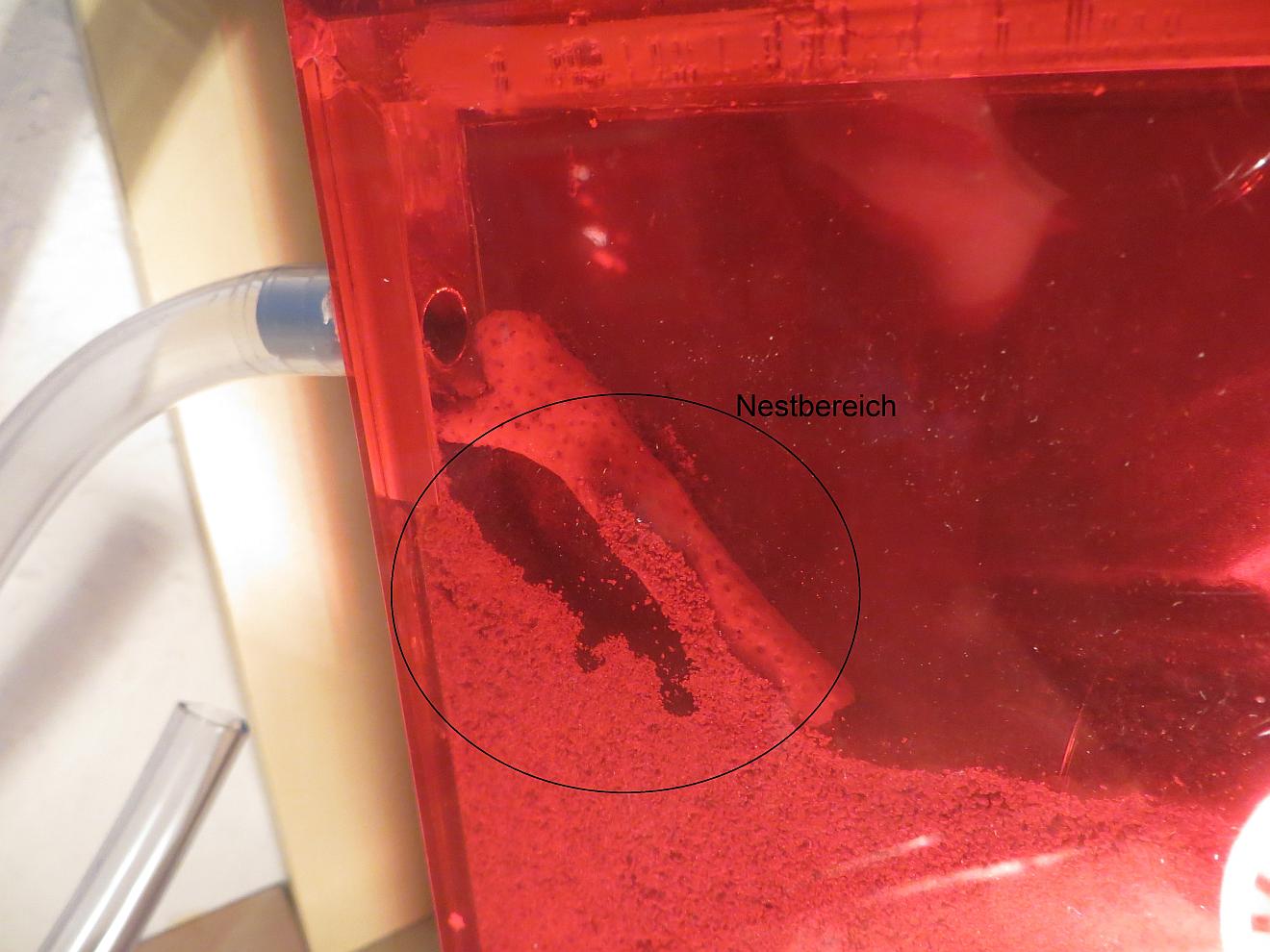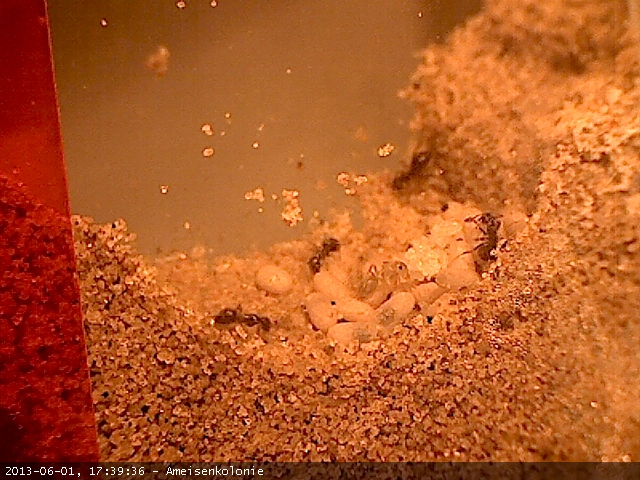 ich bin seit dem 03.04.13 stolzer Besitzer einer kleinen Kolonie Lasius niger. Ist mein erstes Mal zum Thema Ameisenhaltung. Die Kolonie kam per Post im Reagenzglas, 1 Königin und ca. 15 Arbeiterinnen und ein kleiner Haufen Eier. Als Behausung dient ein Starterset bestehend aus einer Glas Arena 20x30cm und eine ĂŒber einen Schlauch angeschlossene Farm gefĂŒllt mit Sand-Lehm-Gemisch. Die Farm wĂŒrde mit roter Folie verdunkelt und wenn ich nicht daheim bin wird sie zusĂ€tzlich noch mit einem StĂŒck Pappe gegen Licht geschĂŒtzt. Die ersten Wochen verhielt sich alles normal (soweit ich das als Einsteiger beurteilen kann). Im Regelfall saßen die Ameisen in ihrem (abgedunkelten) RG und hier und da ließen sich mal einige in der Arena blicken um Wasser oder Honig aufzunehmen. Etwas mehr Action gab es wenn ich MehlwĂŒrmer (ĂŒberbrĂŒht und zerteilt) angeboten habe, dann waren bis zu 6 Ameisen gleichzeitig unterwegs um sich an den Proteinen gĂŒtlich zu tun. Am 20.05. (nach 47 Tagen) zog die Kolonie dann um in die Farm, die ich versucht habe mit WĂ€rme (2x tĂ€glich ~2h mit Lampe) etwas attraktiver als das RG zu gestallten. Sie waren sogar so freundlich den Umzug abzuhalten als ich gerade daneben saß und ich konnte auch mal einen ausgiebigen Blick auf die Brut werfen. Alles da, ca 10. Eier, 7 Larven, 6-7 Puppen . Jetzt leben sie nun schon einige Zeit in der Farm, scheinen dort aber nicht zu graben sonder haben es sich unter einem StĂŒck Koralle das ich als Einstiegshilfe zur Bohrung reingelegt habe bequem gemacht. Die Schlitze zwischen Koralle sowie die Scheiben haben sie mit Sand verklebt. Anbei auch ein Bild fĂŒrs bessere VerstĂ€ndnis, ein Bild sagt mehr als 1000 Worte.