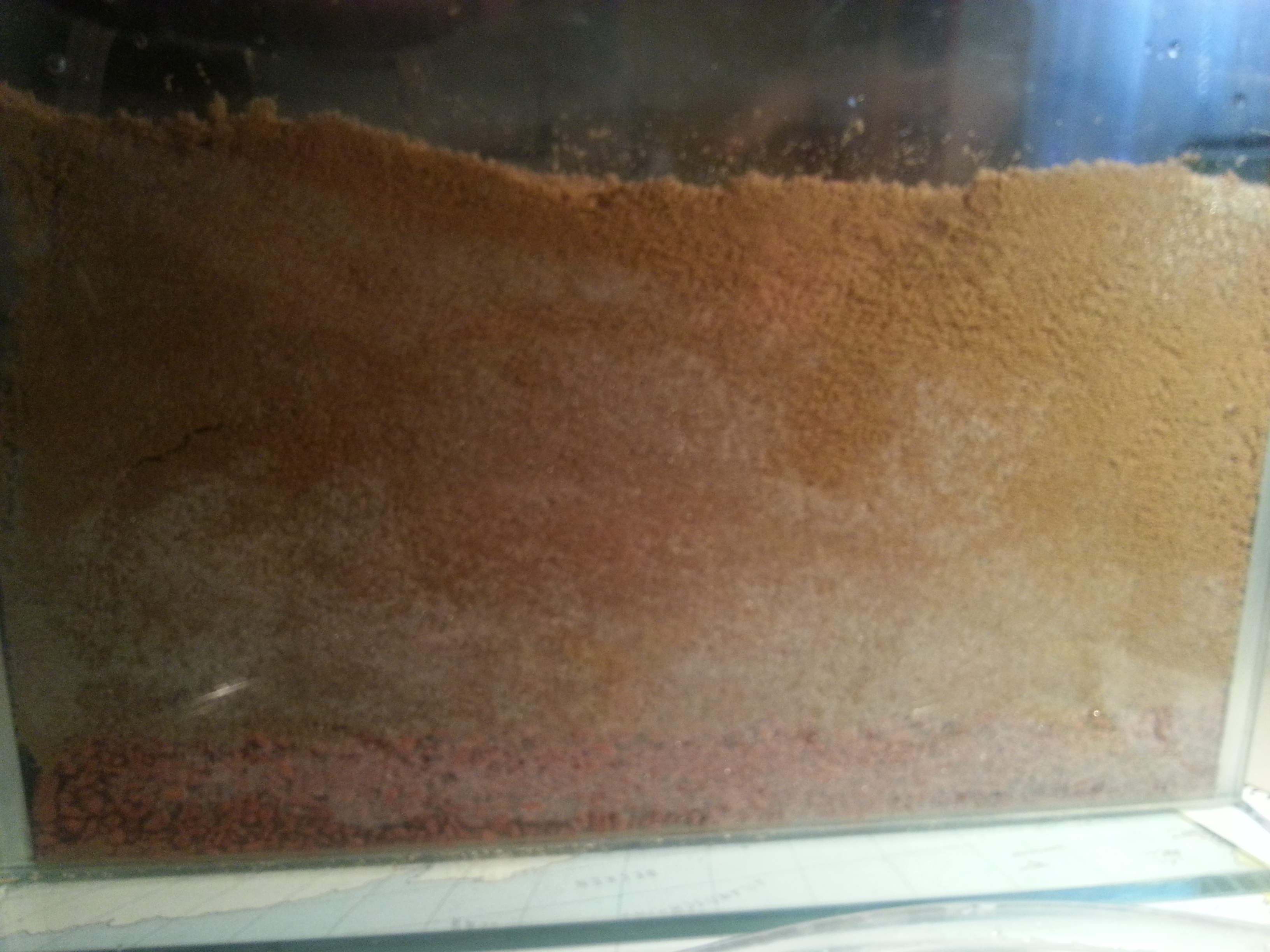 Ich habe zwei Bilder angehĂ€ngt, die meine Farm zeigen, einmal von "vorne" und einmal von "hinten". Der Sand hat sich zwar etwas dunkler gefĂ€rbt aber nicht so, dass man sagen könnte er wĂ€re nass. Von hinten sieht man, dass sich da Feuchtigkeit an der Scheibe absetzt, was fĂŒr mich bedeuten wĂŒrde, dass es zu viel Feuchtigkeit ist.