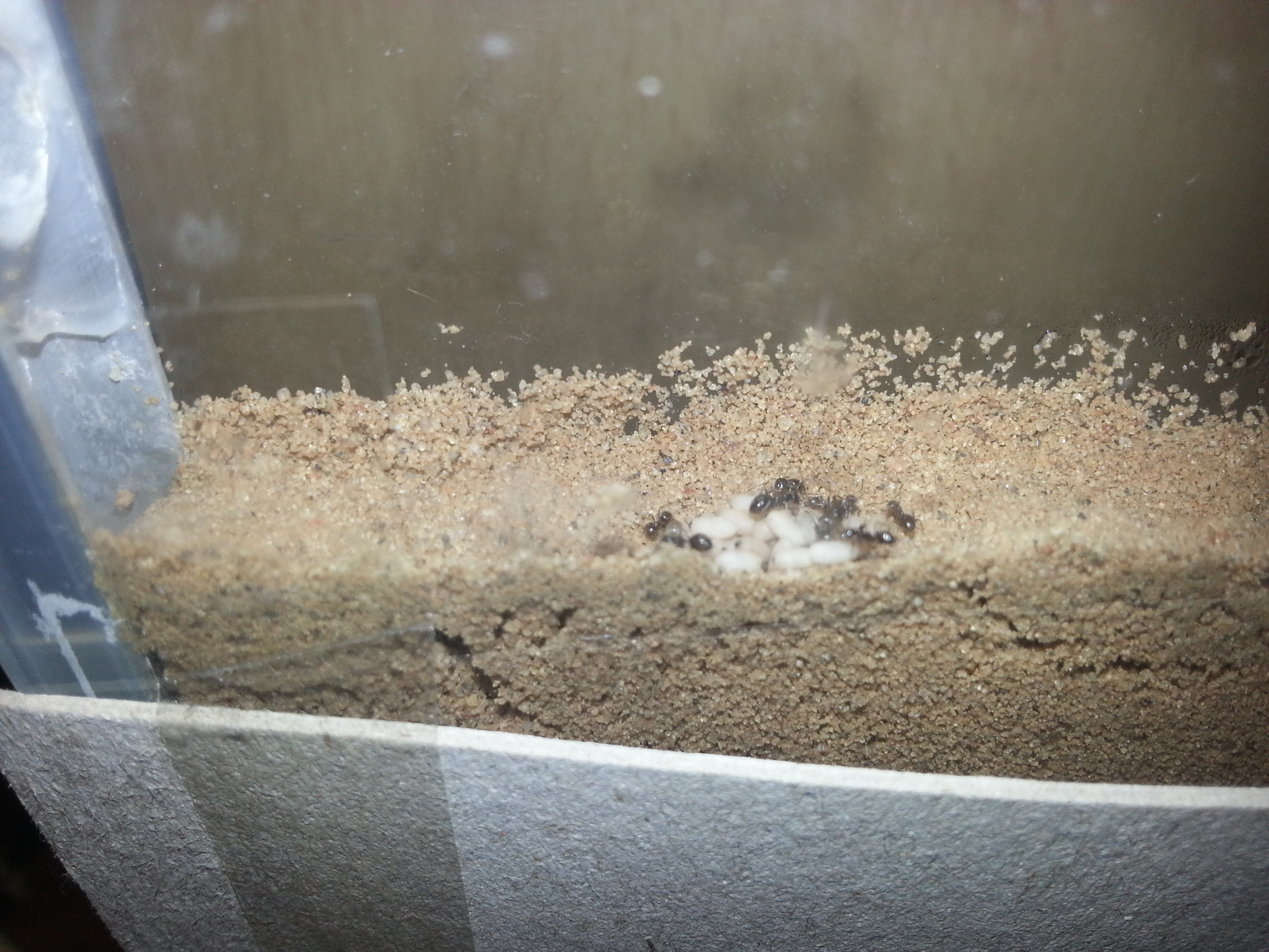 meine Lasius niger (jetzt etwas mehr als zwei Monate in meinem Besitz, gekauft mit ~20 Arbeiterinnen und seit ungefähr 1.5 Monate in die Farm umgezogen) haben ihre Brut (so weit ich das beurteilen kann nur Puppen) außerhalb des Nestes! Zwar immer noch in der Farm, aber nicht, wie vorher, ganz unten beim Granulat, sondern an der Oberfläche.