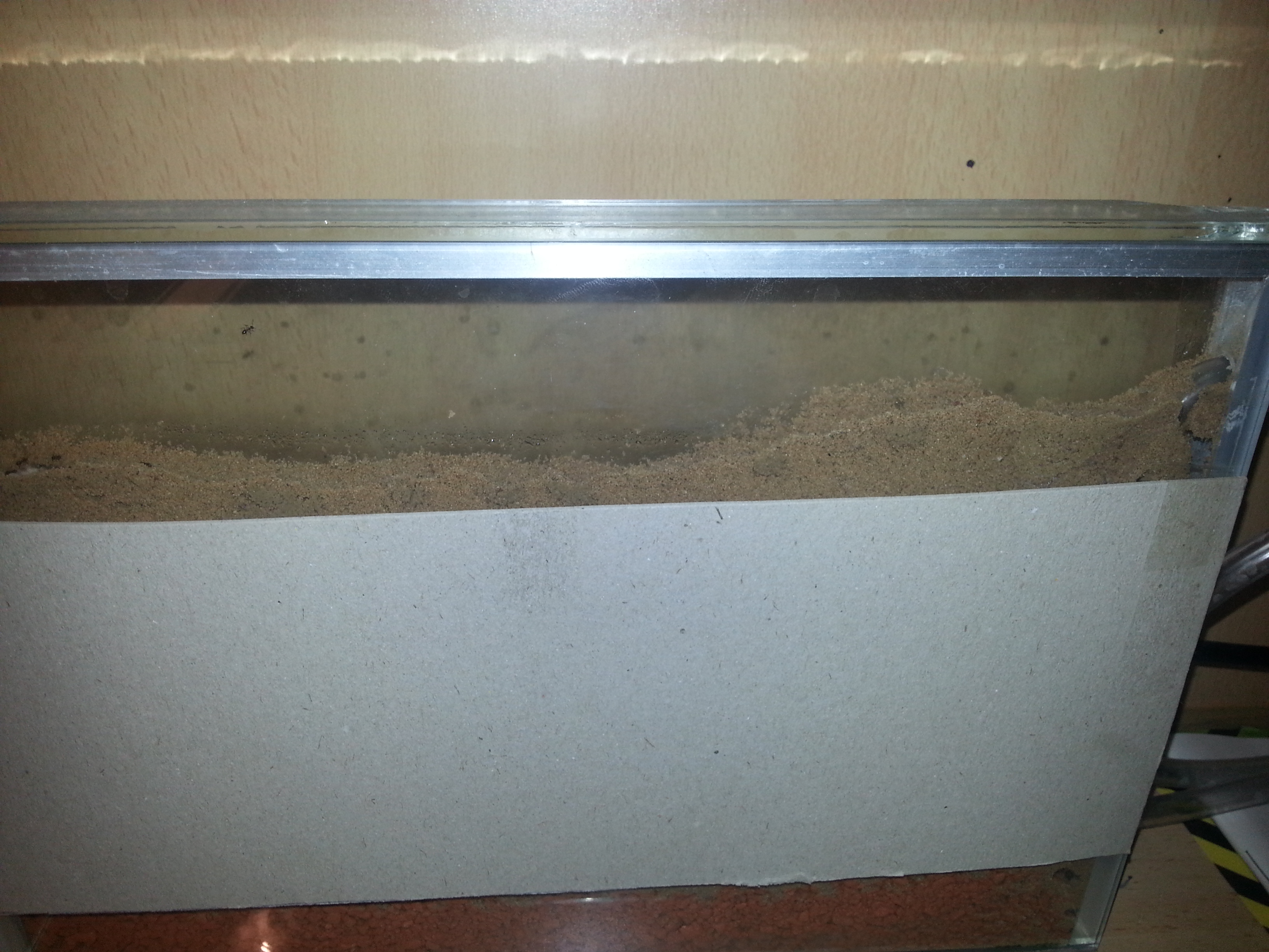 Vor einigen Tagen war der Zustand schon einmal, ich habe dann die Hinterseite der Farm in Augenschein genommen (wollte sehen was da ist(Schimmel, etc.)) und musste dabei eben die Farm etwas bewegen. Das hat dann dazu geführt, dass die Ameisen ihre Puppen ganz schnell wieder reingeräumt haben. Nun ist es aber wieder so....