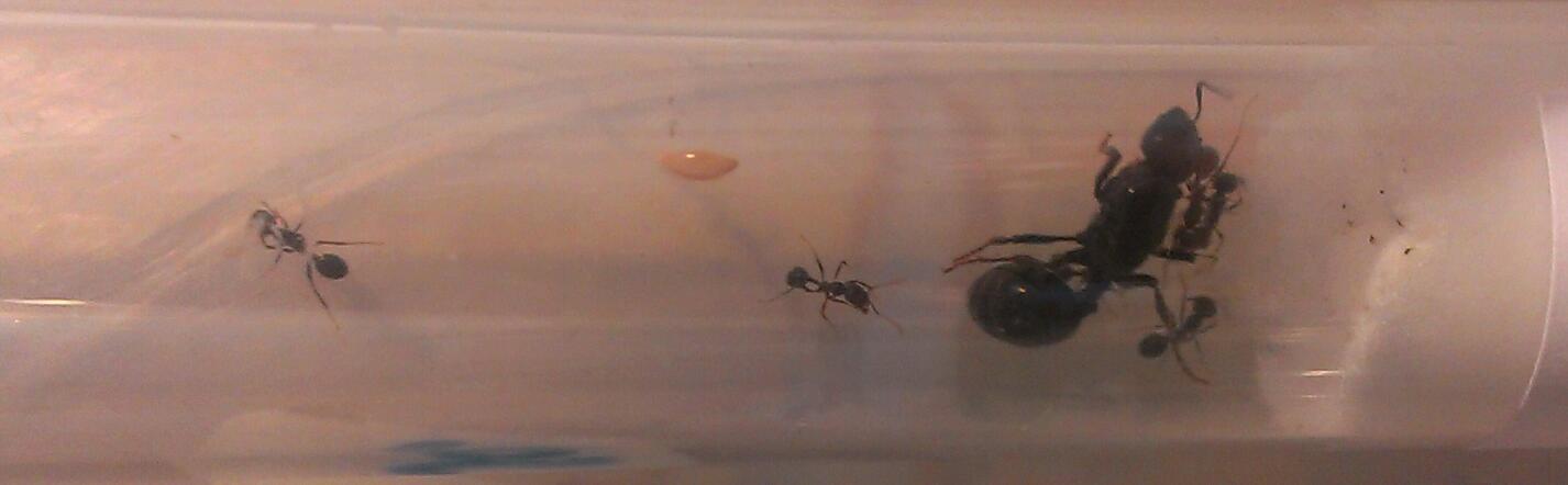 Noch befinden sie sich in einer provisorischen Tupperdose. Ich habe ihnen einen kleinen Klecks Honig, ein paar Fruchtfliegen und zerquetsche Körner gegeben.