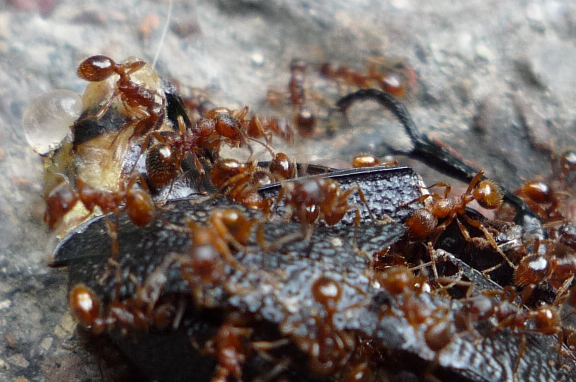 Eine Gruppe von Ameisen, die einen toten KĂ€fer fressen (oder zerlegen), rot-orange, etwa 5-6mm groĂ?