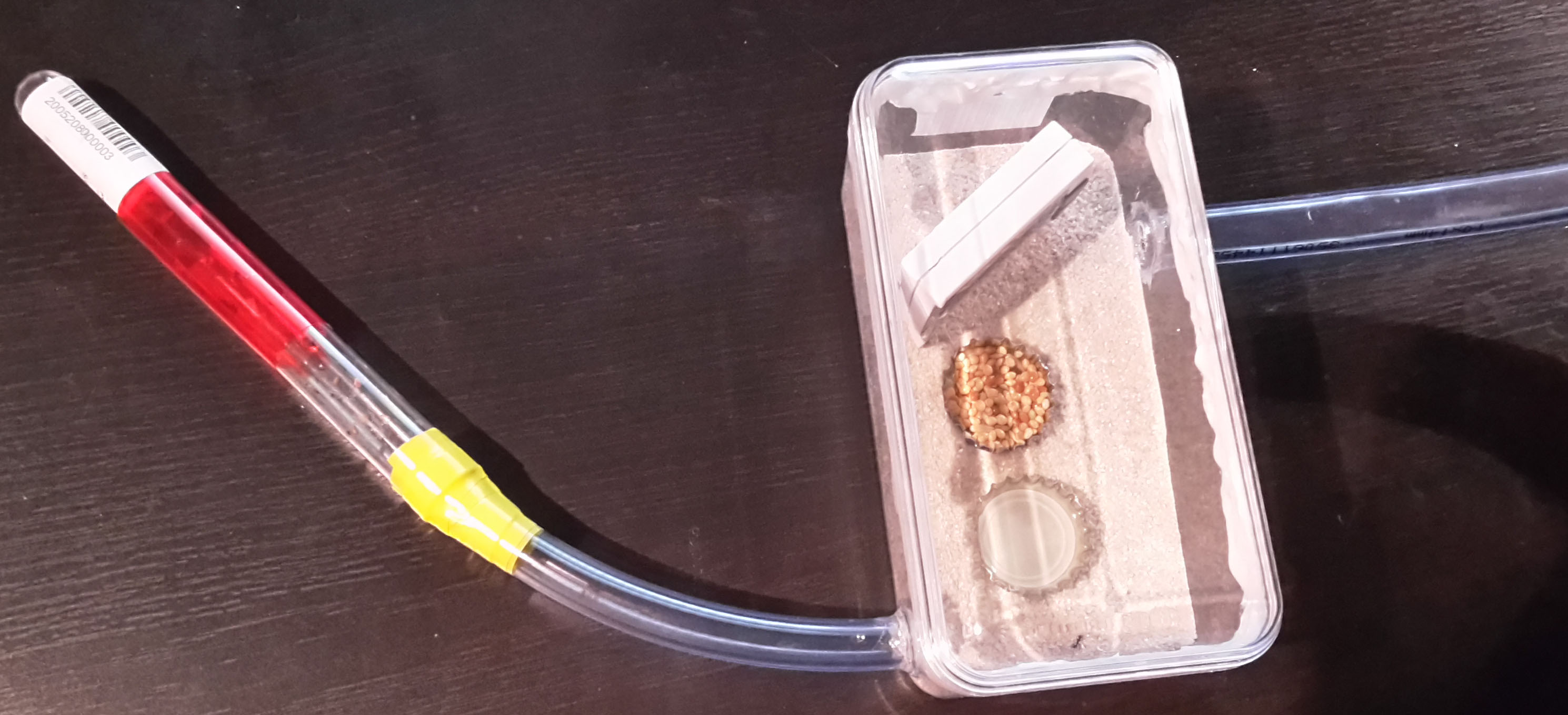 Für meine erste Anlage habe ich mich für ein Gips-Nest Marke Rocher entschieden. Das Neste sollte möglichst klein sein, da die jüngeren Kolonien zu ängstlich sind um einzuziehen (hab ich mehrfach gelesen). Mittels Holzbohrer habe ich den Eingang vorsichtig hineingefräst. Zudem habe ich an der Stirnseite ein 1,5 ml Reaktionsgefäß ("Eppi") installiert, welches mir später bei der Wässerung des Gips helfen soll. Dieses Eppi wurde mit einer heißen Nadel mehrfach durchstochen, um eine Art Drainage zu erhalten. Mit Knete habe ich die Gänge in der Box vorgeformt und anschließend mit Modelier-Gips ausgegossen. Den Deckel habe ich mit einer heißen Nadel ebenfalls perforiert, um den Gips von hinten (nur) leicht zu belüften. Zum Schluss wurde noch rote Filterfolie mittels Klebestreifen davorgehängt (kA. ob das was hilft, dazu habe ich unterschiedliches gelesen; aber es verdunkelt auf jeden Fall enorm).