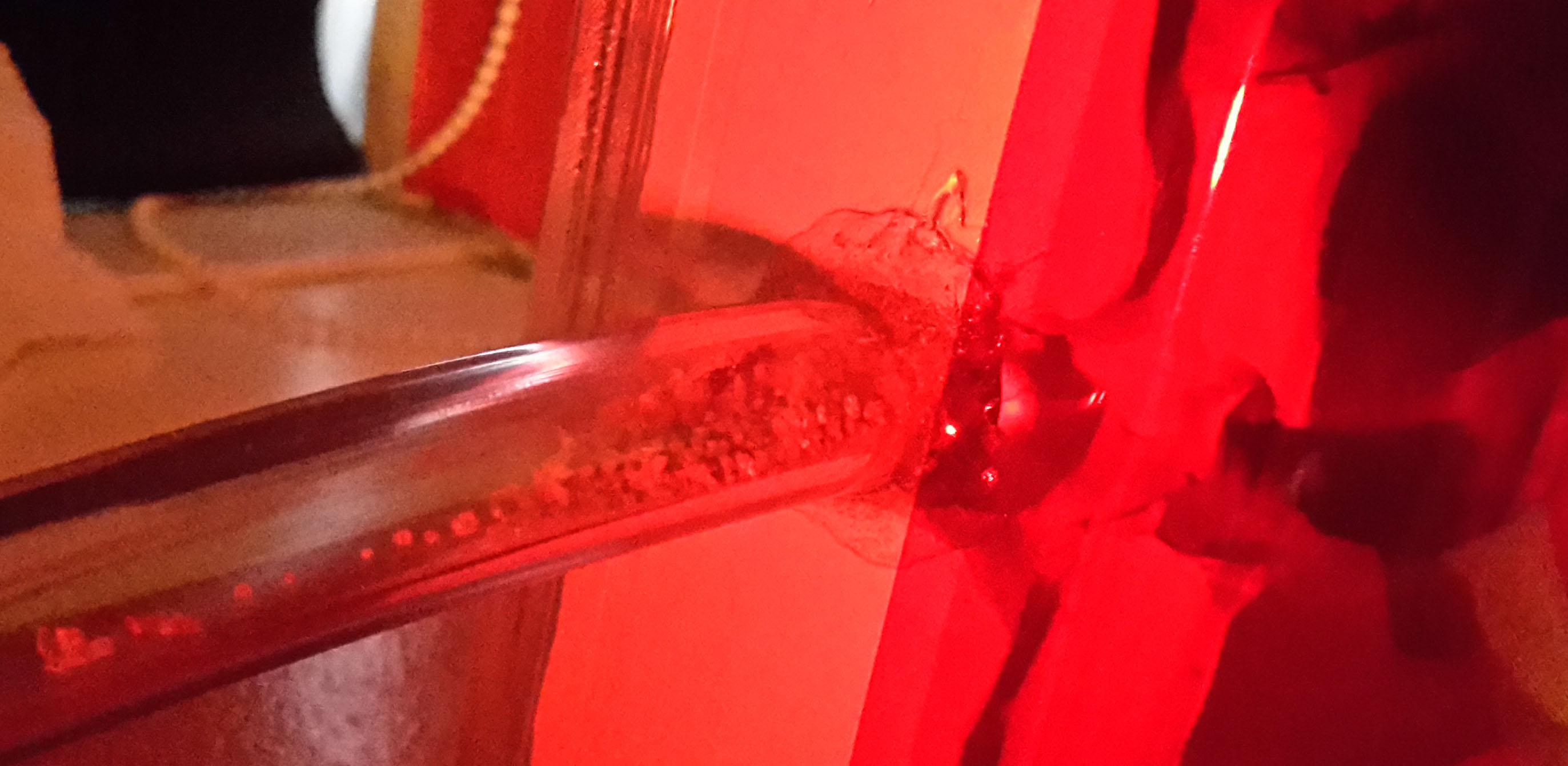 Eine weitere Schlauchverbindung geht nun zum Reagenzglas, verklebt durch Isolierband.