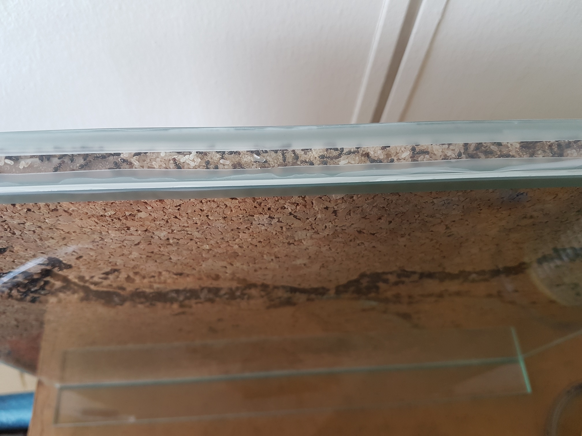 Einen Monat ist es nun her, als ich die ersten Eier entdeckt hatte. Zwischenzeitlich lag das RG in einer dunklen Schublade. Die Temperatur liegt bei 24°C. Ich habe wöchentlich einen kleinen Tropfen Honigwasser angeboten, welches immer sofort gefunden und getrunken wird. Das erste Mal war ich ein wenig perplex... der